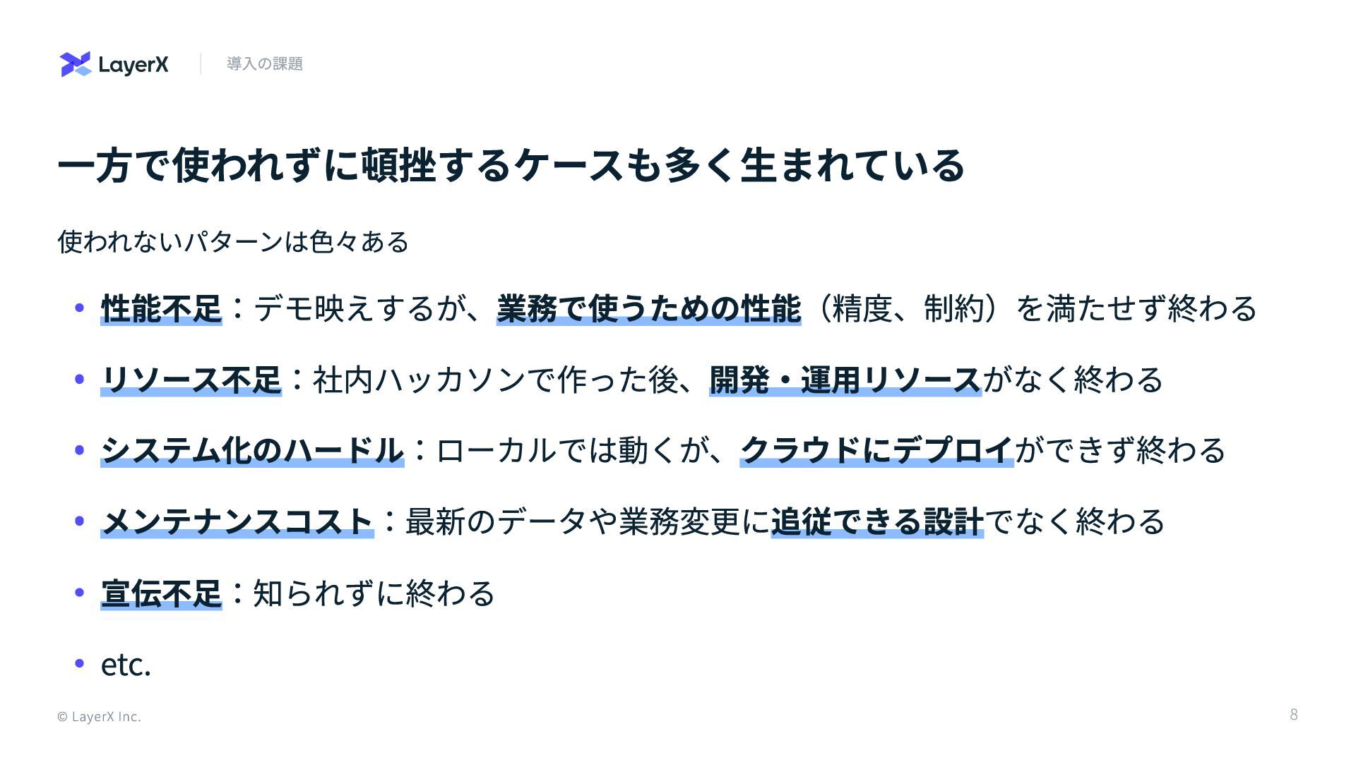 一方で使われずに頓挫するケースも多く生まれている 使われないパターンは色々ある © LayerX Inc. 導入の課題 性能不足:デモ映えするが、業務で使うための性能(精度、制約)を満たせず終わる リソース不足:社内ハッカソンで作った後、開発・運用リソースがなく終わる システム化のハードル:ローカルでは動くが、クラウドにデプロイができず終わる メンテナンスコスト:最新のデータや業務変更に追従できる設計でなく終わる