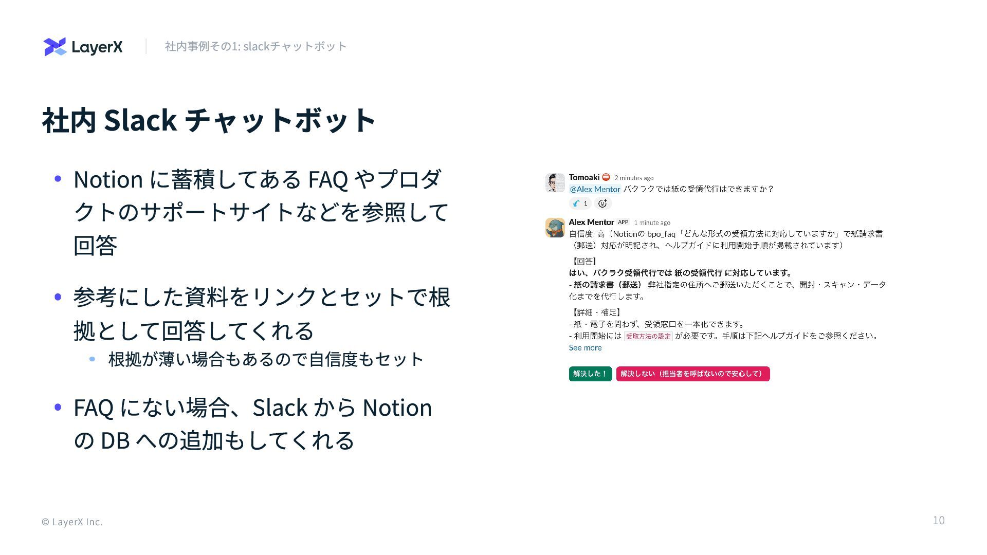 回答 参考にした資料をリンクとセットで根 拠として回答してくれる 根拠が薄い場合もあるので自信度もセット FAQ にない場合、Slack から Notion の DB への追加もしてくれる © LayerX Inc. 10