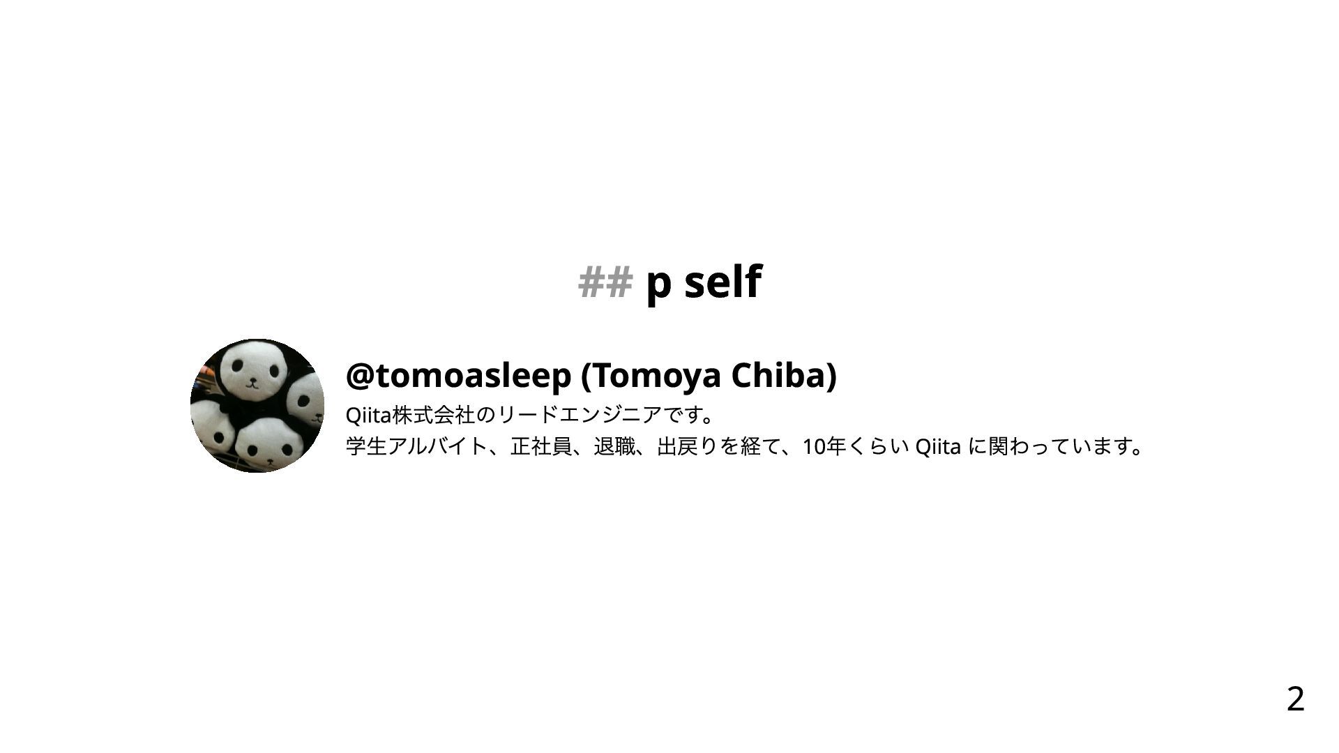 @tomoasleep (Tomoya Chiba) Qiita 株式会社のリードエンジニアです。 学生アルバイト、正社員、退職、出戻りを経て、10 年くらい Qiita に関わっています。 ##
