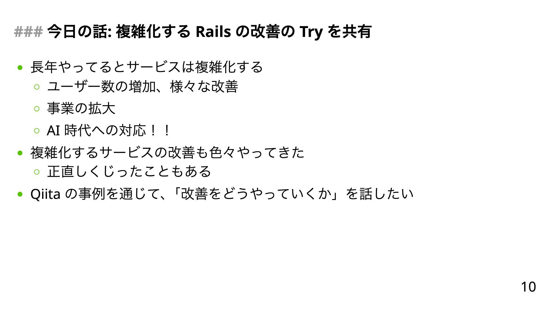 ### 今日の話: 複雑化する Rails の改善の Try を共有 10