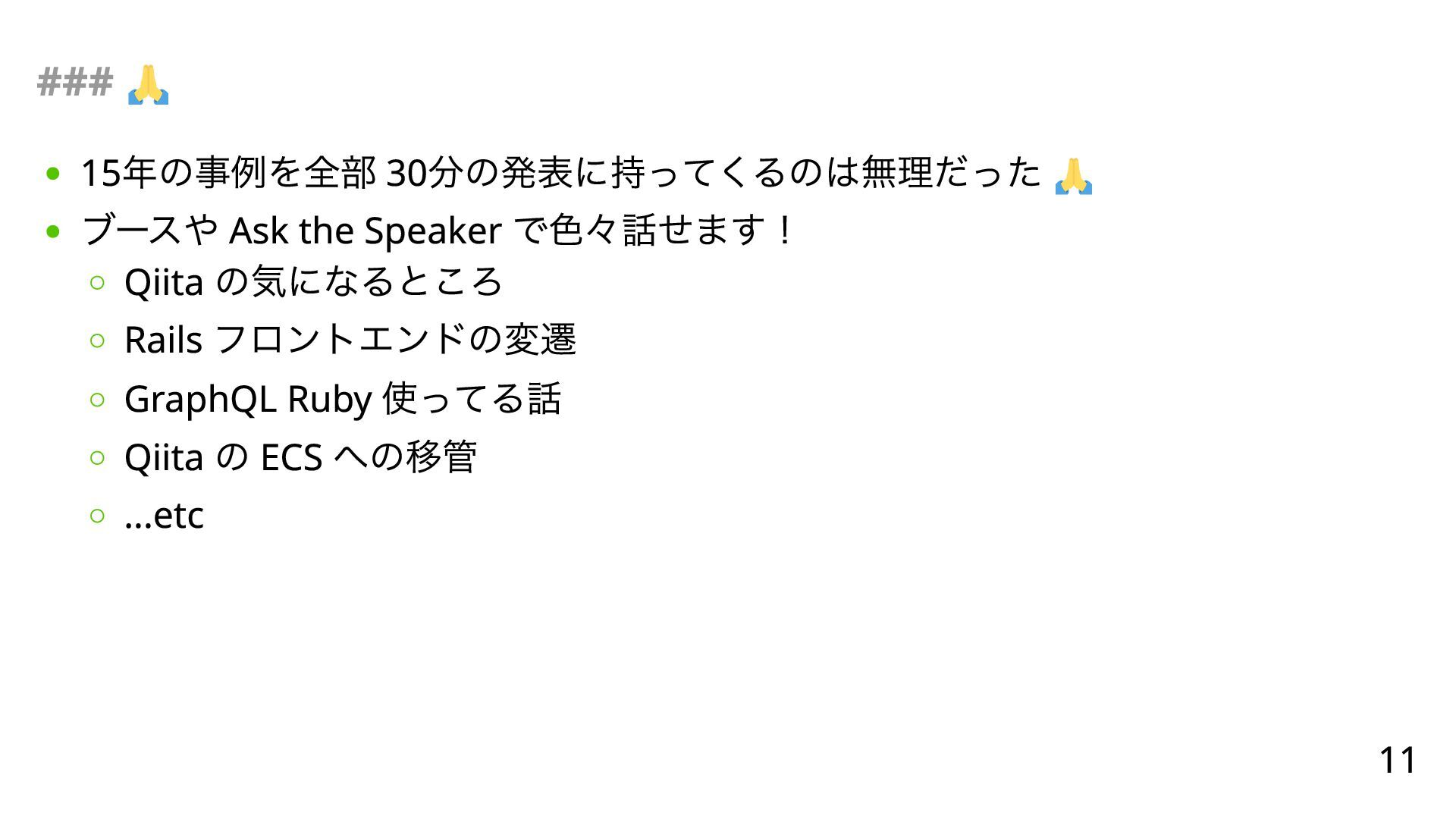 の気になるところ Rails フロントエンドの変遷 GraphQL Ruby 使ってる話 Qiita の ECS への移管 ...etc ### 11