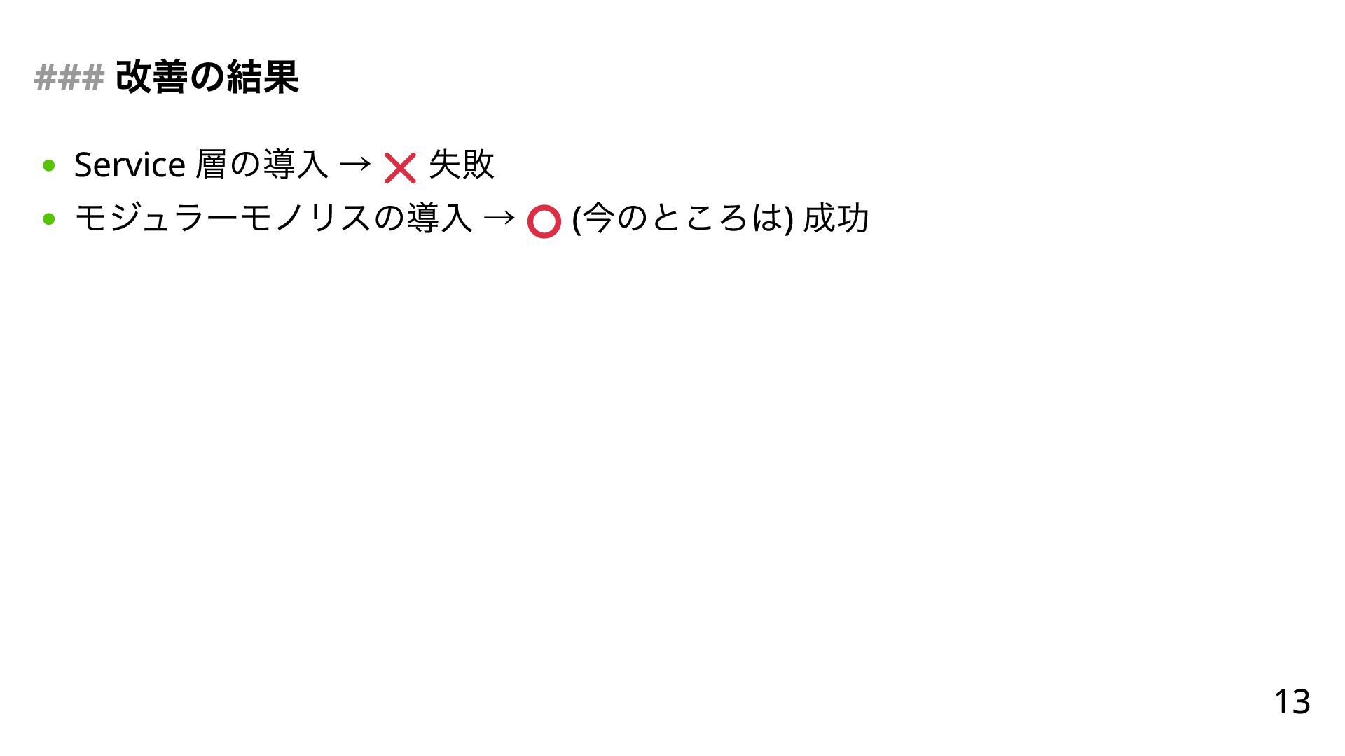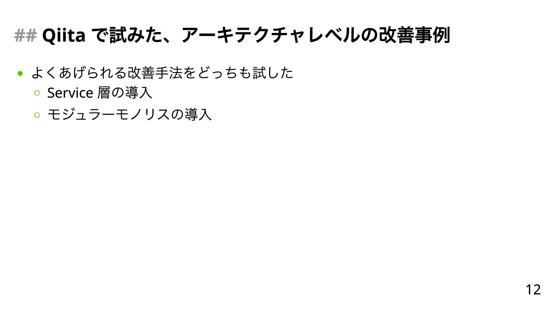 よくあげられる改善手法をどっちも試した Service 層の導入 モジュラーモノリスの導入 ## Qiita で試みた、アーキテクチャレベルの改善事例 12