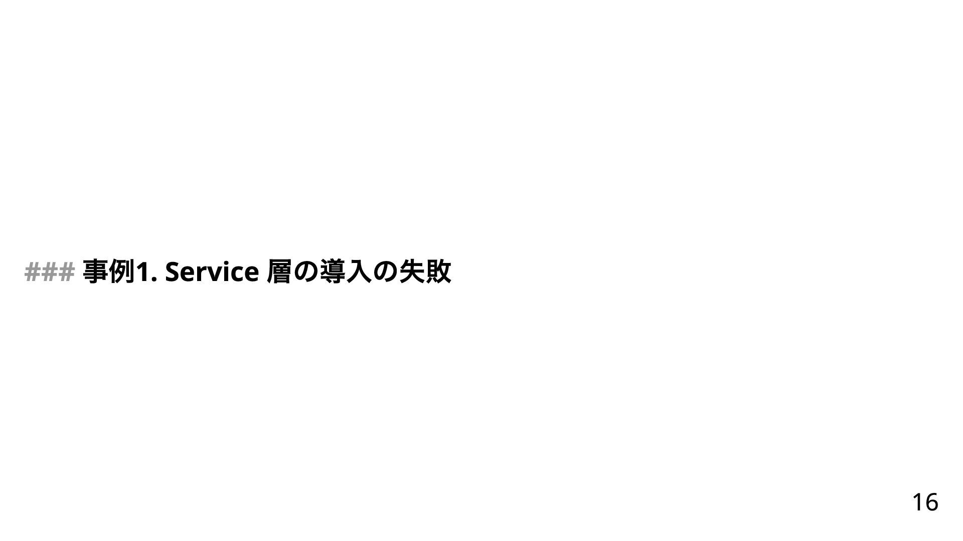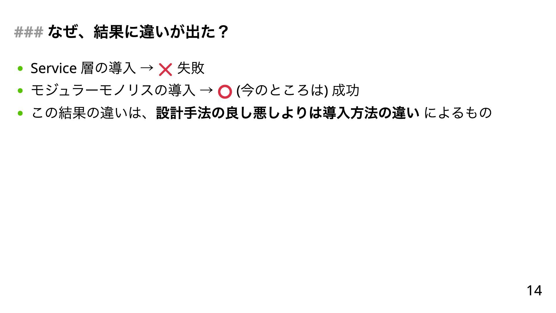 Service 層の導入 → 失敗 モジュラーモノリスの導入 → ( 今のところは) 成功 この結果の違いは、設計手法の良し悪しよりは導入方法の違い