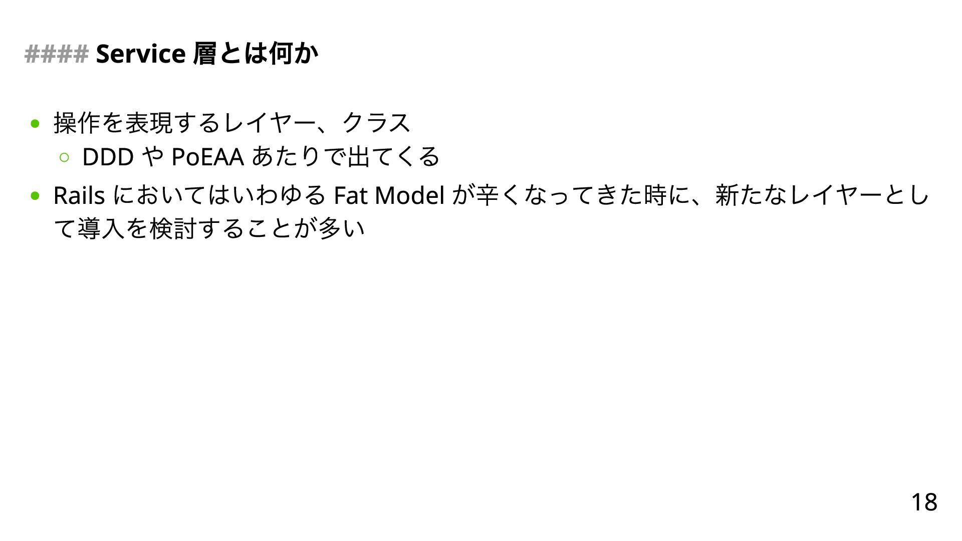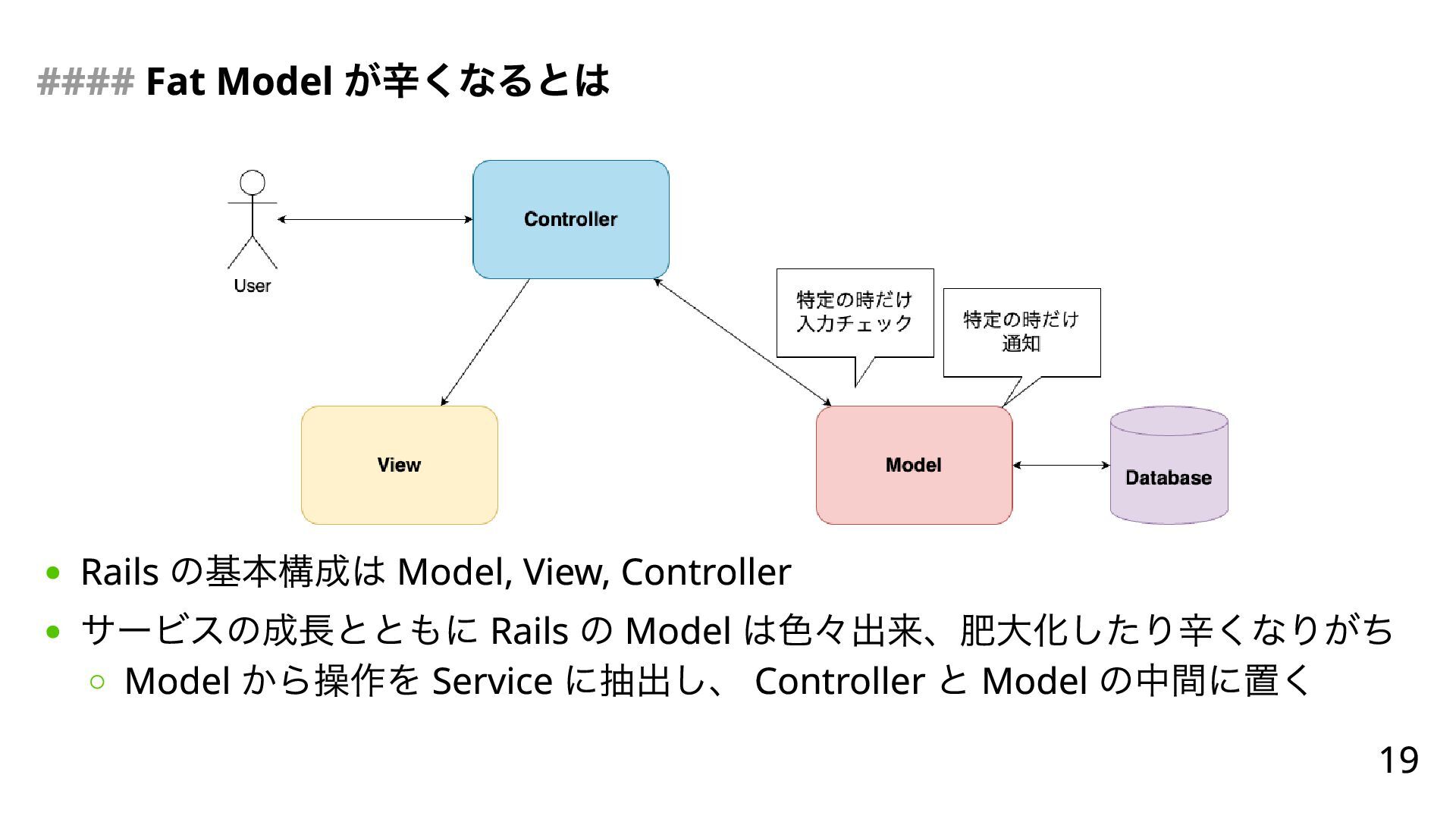 Model から操作を Service に抽出し、 Controller と Model の中間に置く #### Fat Model が辛くなるとは 19