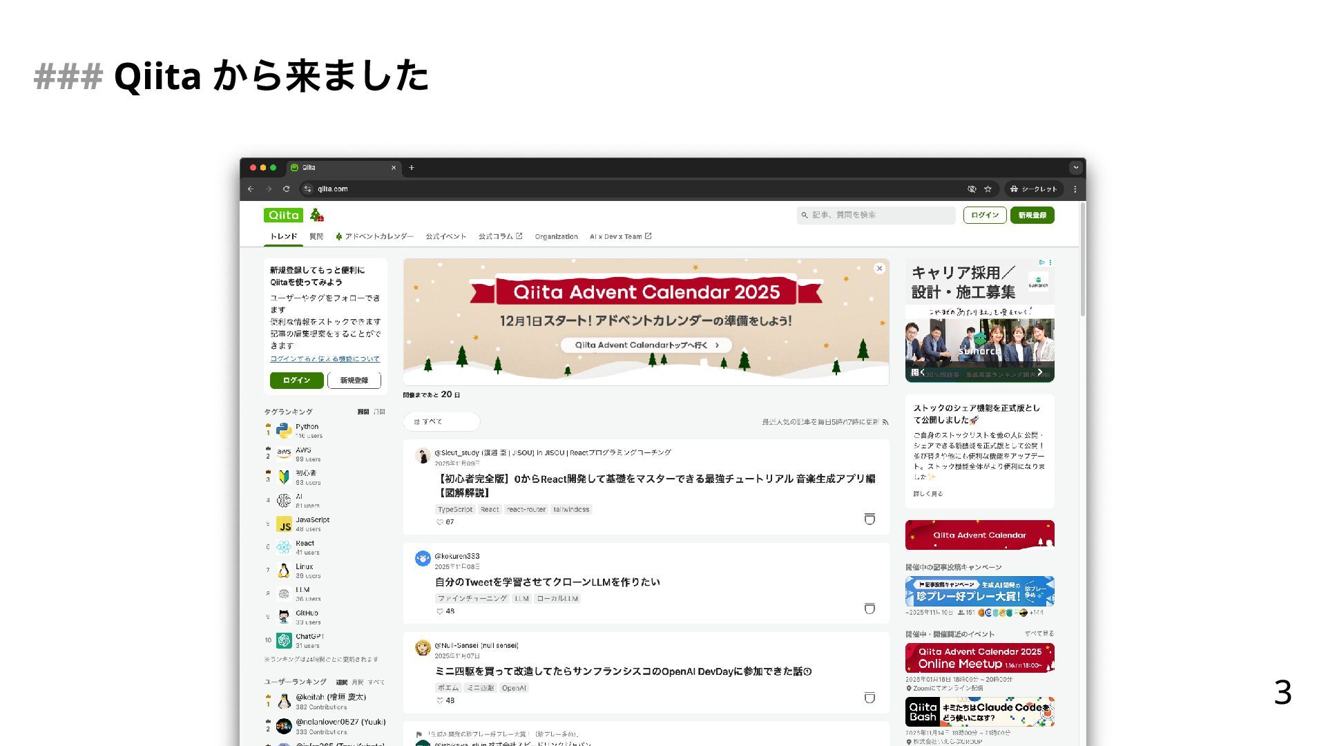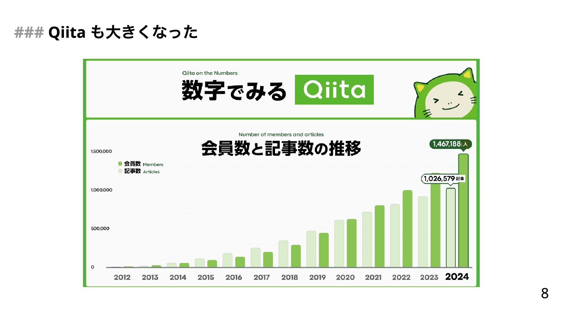 長年やってるとサービスは複雑化する ユーザー数の増加、様々な改善 事業の拡大 AI 時代への対応!! 複雑化するサービスの改善も色々やってきた 正直しくじったこともある Qiita の事例を通じて、 「改善をどうやっていくか」を話したい