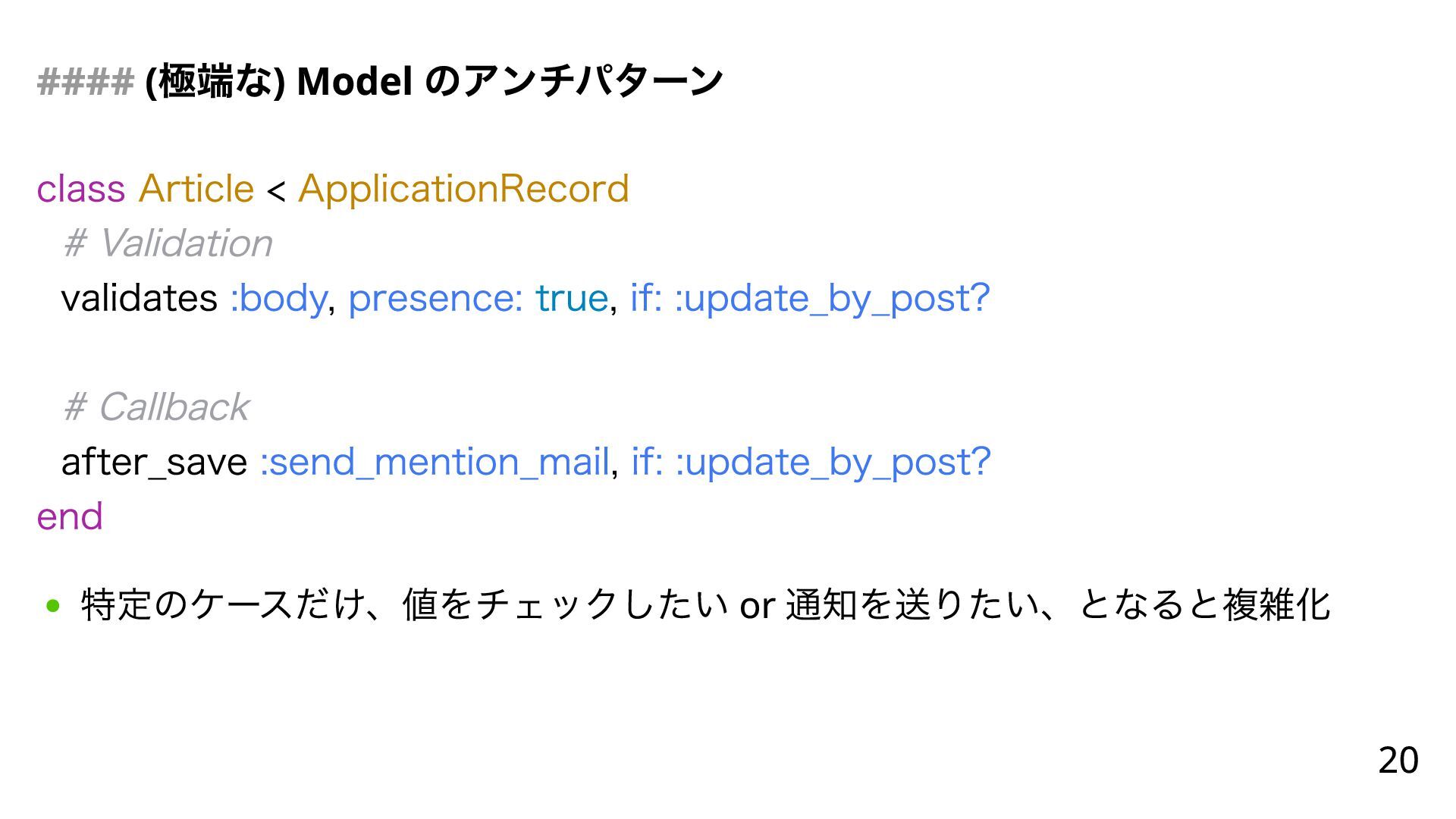 if: :update_by_post? # Callback after_save :send_mention_mail, if: :update_by_post? end 特定のケースだけ、値をチェックしたい or 通知を送りたい、となると複雑化 #### ( 極端な) Model のアンチパターン 20