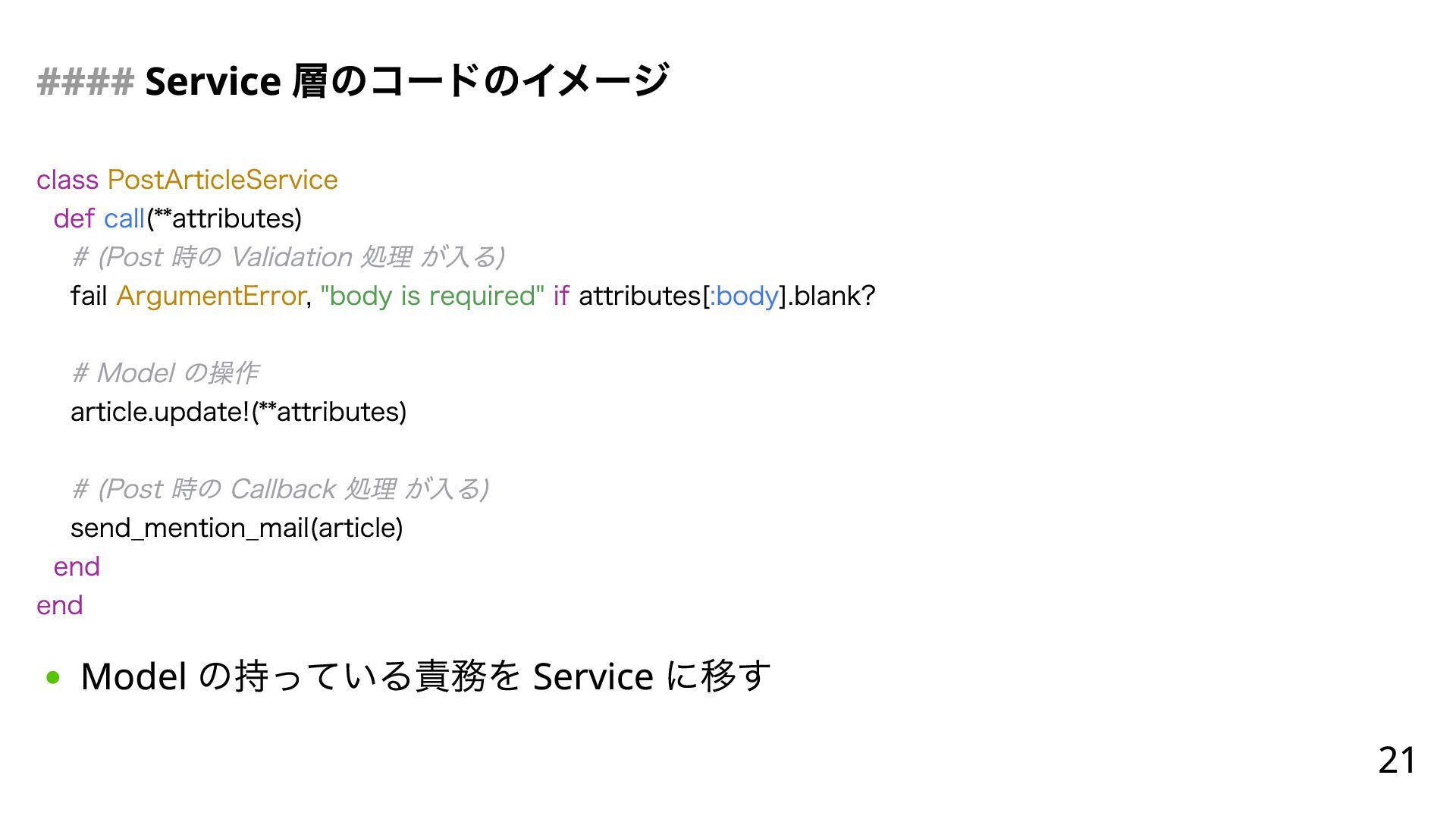fail ArgumentError, "body is required" if attributes[:body].blank? # Model の操作 article.update!(**attributes) # (Post 時の Callback 処理 が入る) send_mention_mail(article) end end Model の持っている責務を Service に移す #### Service 層のコードのイメージ 21