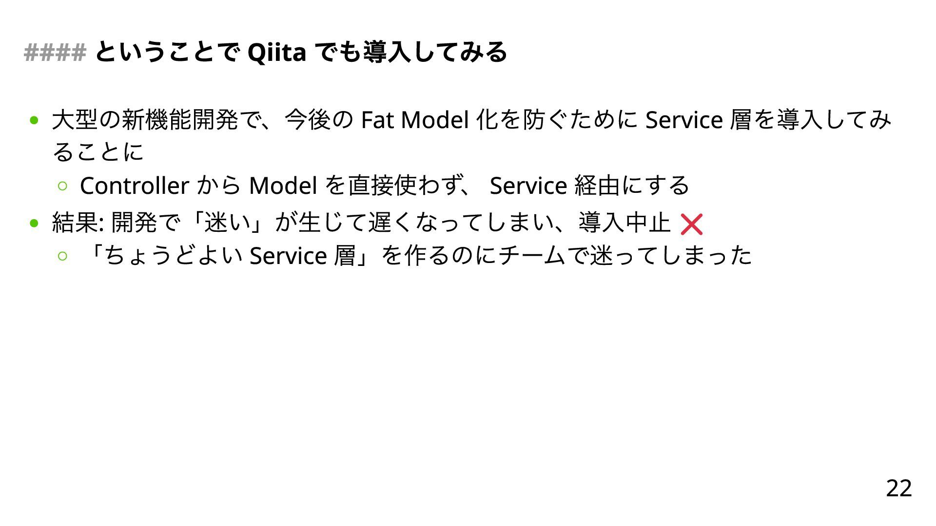 を直接使わず、 Service 経由にする 結果: 開発で「迷い」が生じて遅くなってしまい、導入中止 「ちょうどよい Service 層」を作るのにチームで迷ってしまった #### ということで Qiita でも導入してみる 22