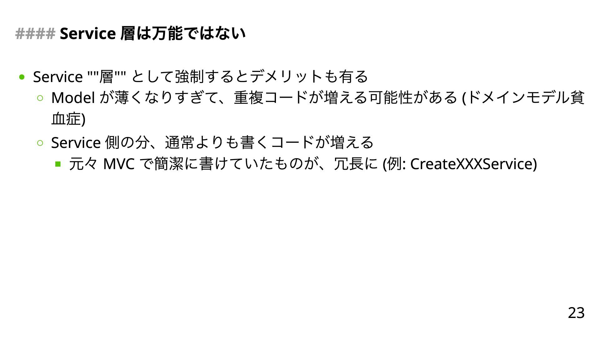 側の分、通常よりも書くコードが増える 元々 MVC で簡潔に書けていたものが、冗長に ( 例: CreateXXXService) #### Service 層は万能ではない 23