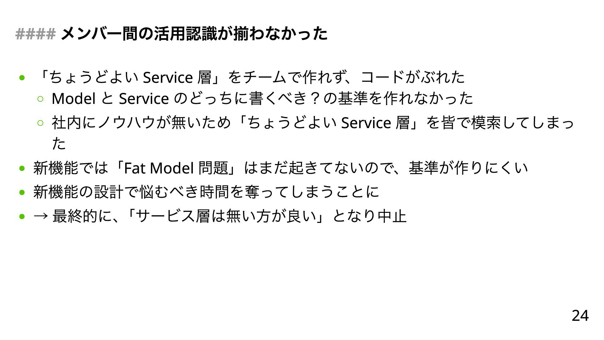 た 新機能では「Fat Model 問題」はまだ起きてないので、基準が作りにくい 新機能の設計で悩むべき時間を奪ってしまうことに → 最終的に、 「サービス層は無い方が良い」となり中止 #### メンバー間の活用認識が揃わなかった 24