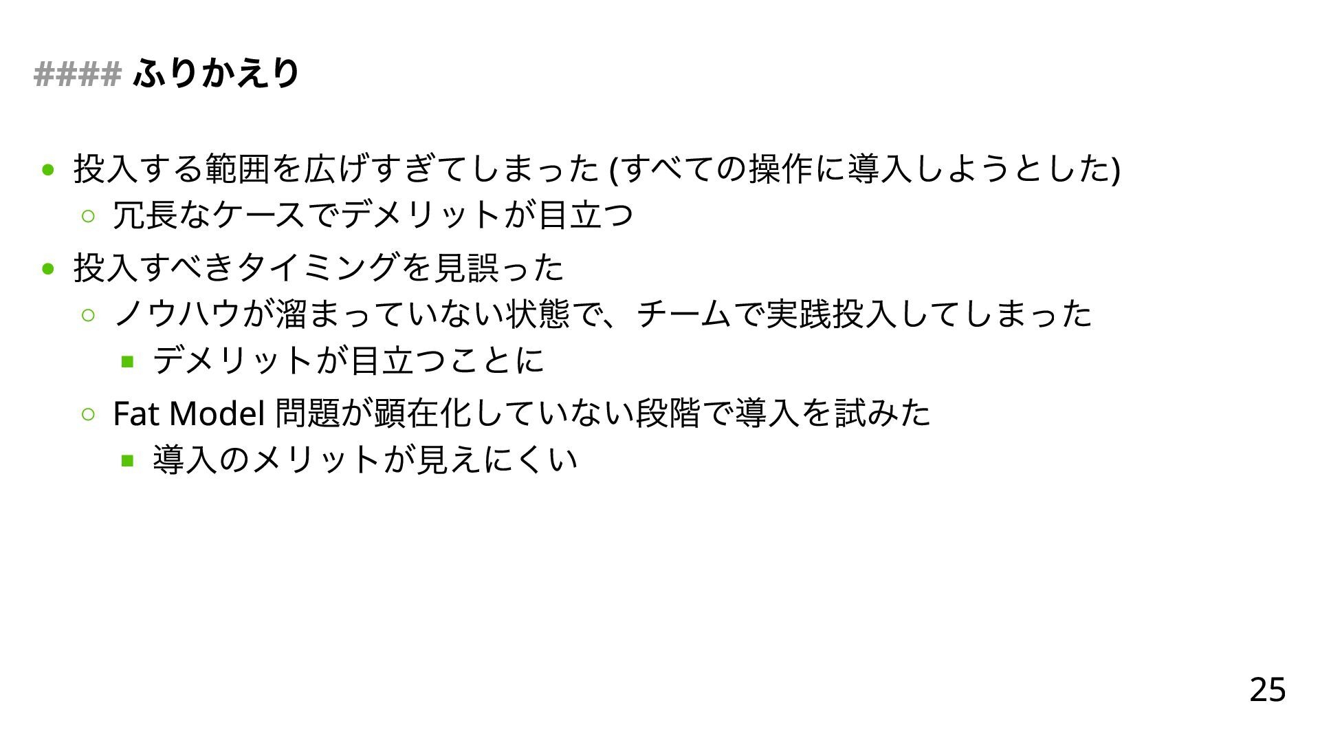 投入する範囲を広げすぎてしまった ( すべての操作に導入しようとした) 冗長なケースでデメリットが目立つ 投入すべきタイミングを見誤った ノウハウが溜まっていない状態で、チームで実践投入してしまった デメリットが目立つことに Fat Model 問題が顕在化していない段階で導入を試みた