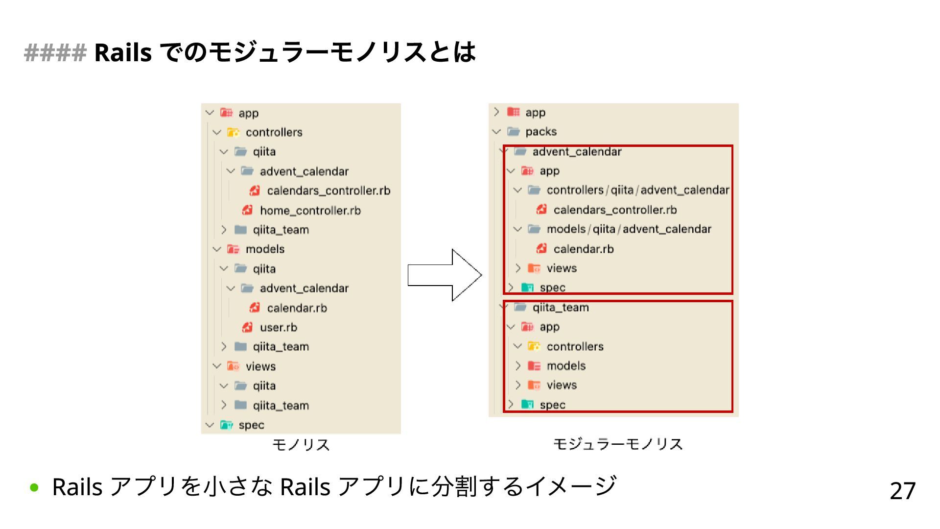 Rails アプリを小さな Rails アプリに分割するイメージ #### Rails でのモジュラーモノリスとは 27