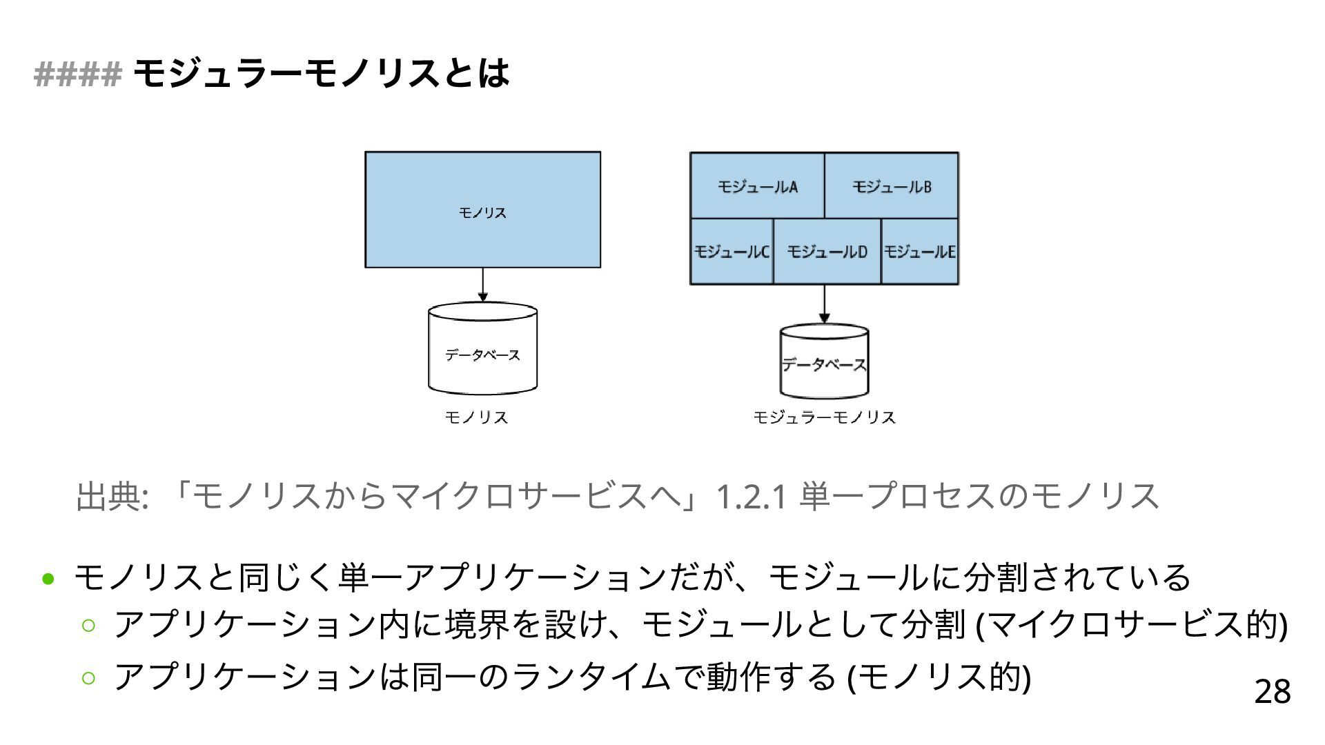 出典: 「モノリスからマイクロサービスへ」1.2.1 単一プロセスのモノリス モノリスと同じく単一アプリケーションだが、モジュールに分割されている アプリケーション内に境界を設け、モジュールとして分割 ( マイクロサービス的) アプリケーションは同一のランタイムで動作する ( モノリス的)