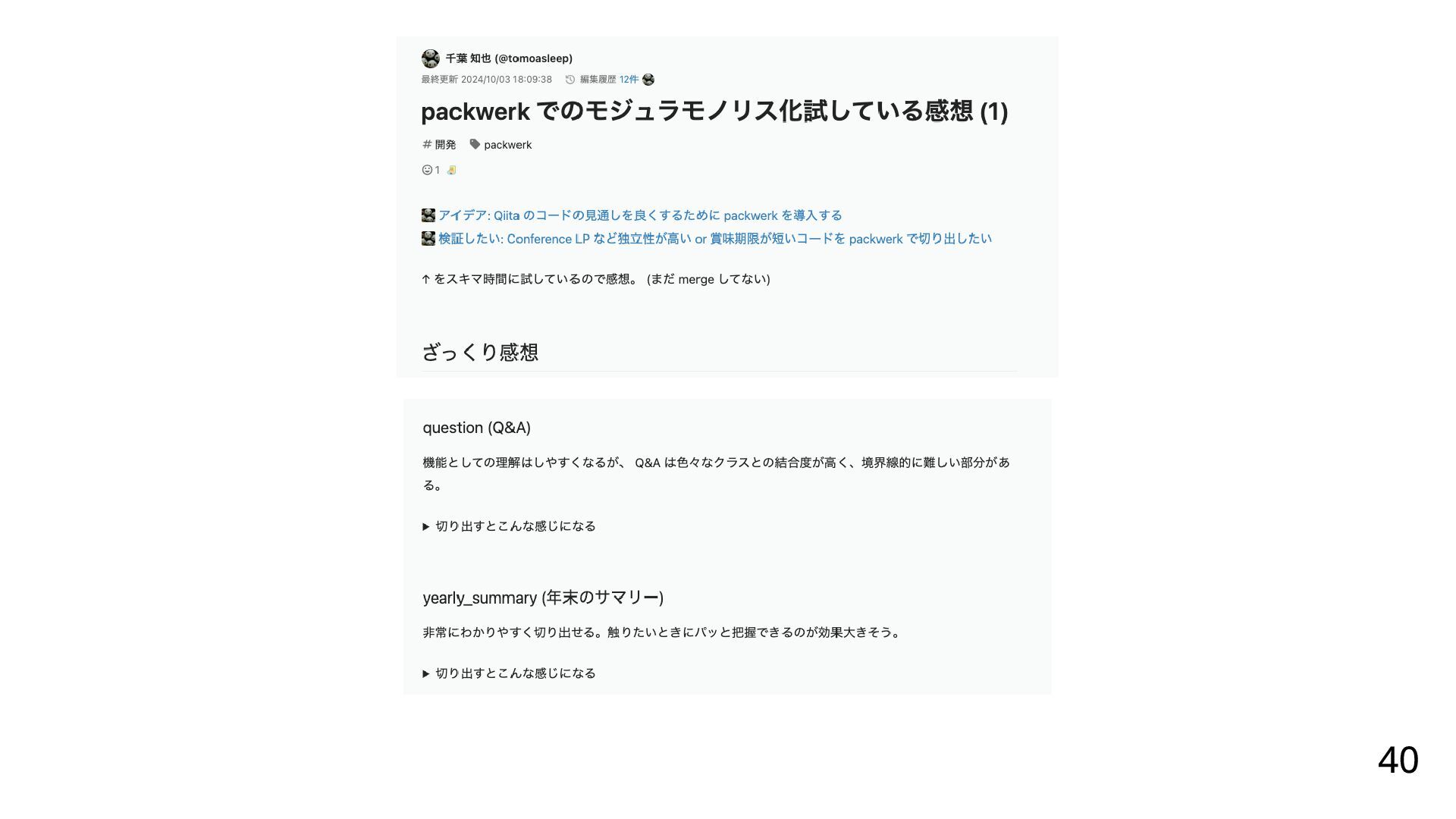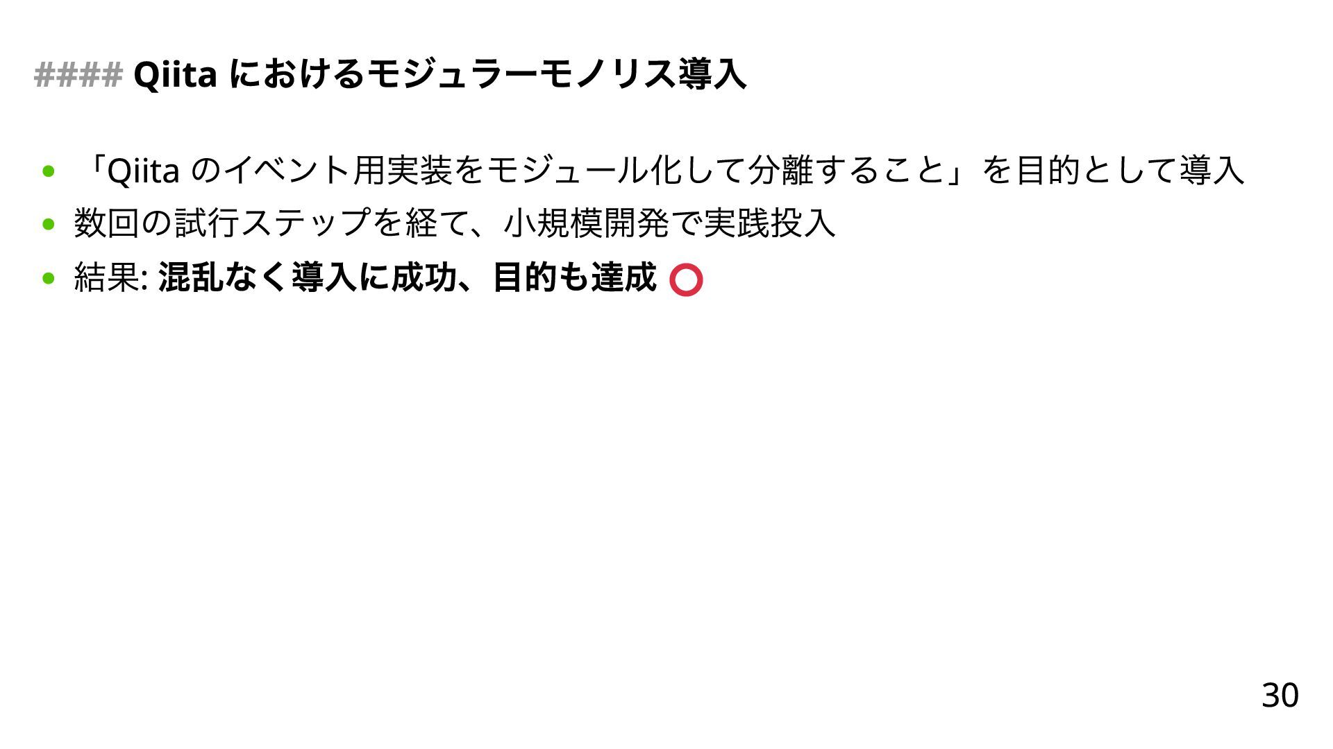 「Qiita のイベント用実装をモジュール化して分離すること」を目的として導入 数回の試行ステップを経て、小規模開発で実践投入 結果: 混乱なく導入に成功、目的も達成 #### Qiita におけるモジュラーモノリス導入 30