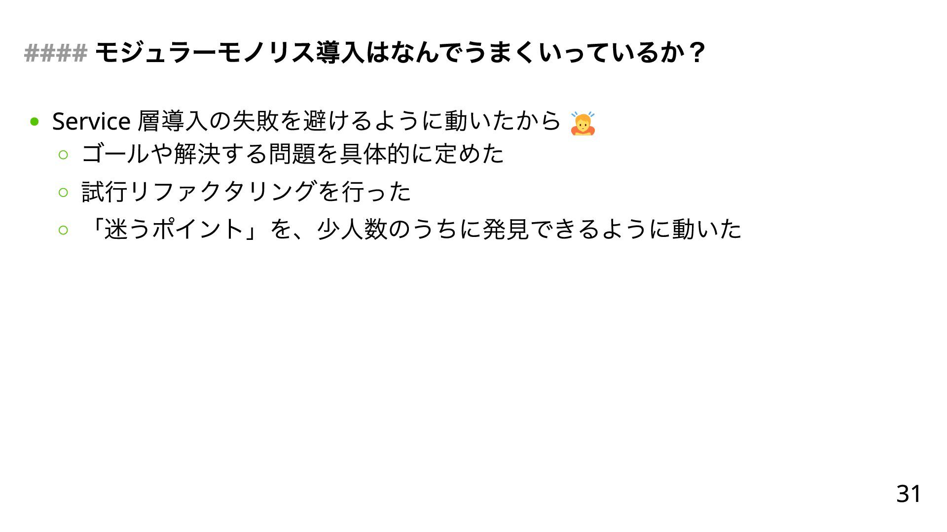 Service 層導入の失敗を避けるように動いたから ゴールや解決する問題を具体的に定めた 試行リファクタリングを行った 「迷うポイント」を、少人数のうちに発見できるように動いた #### モジュラーモノリス導入はなんでうまくいっているか? 31