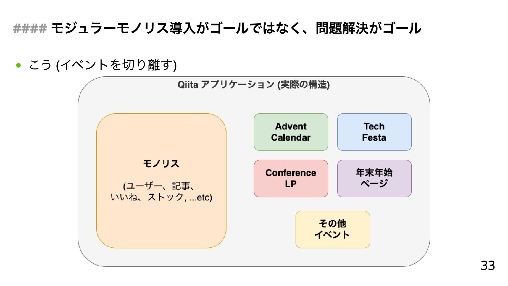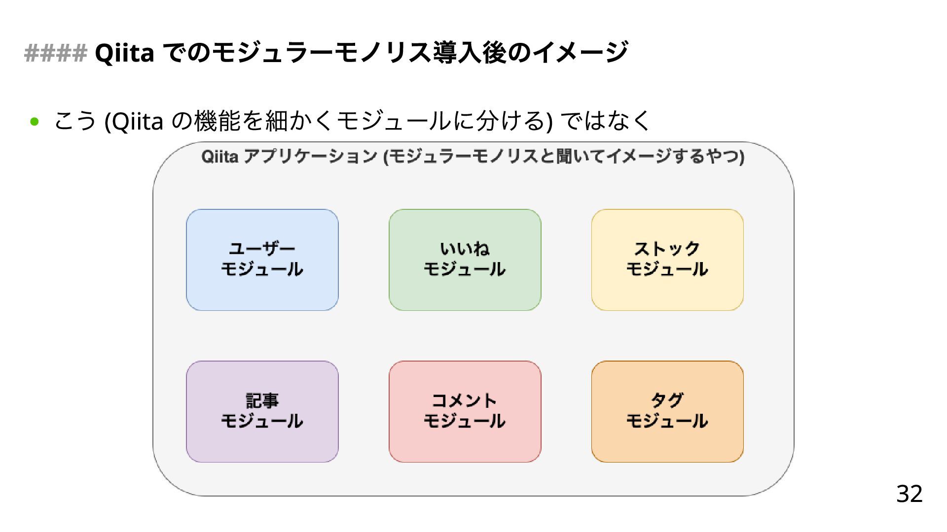 こう (Qiita の機能を細かくモジュールに分ける) ではなく #### Qiita でのモジュラーモノリス導入後のイメージ 32