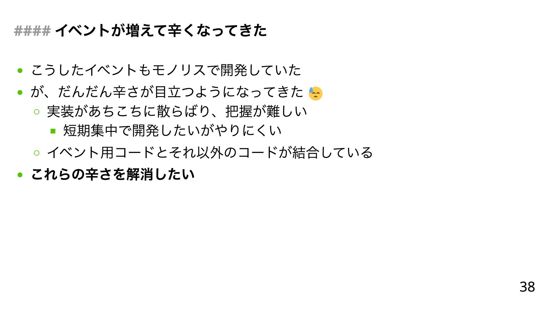 こうしたイベントもモノリスで開発していた が、だんだん辛さが目立つようになってきた 実装があちこちに散らばり、把握が難しい 短期集中で開発したいがやりにくい イベント用コードとそれ以外のコードが結合している これらの辛さを解消したい #### イベントが増えて辛くなってきた 38