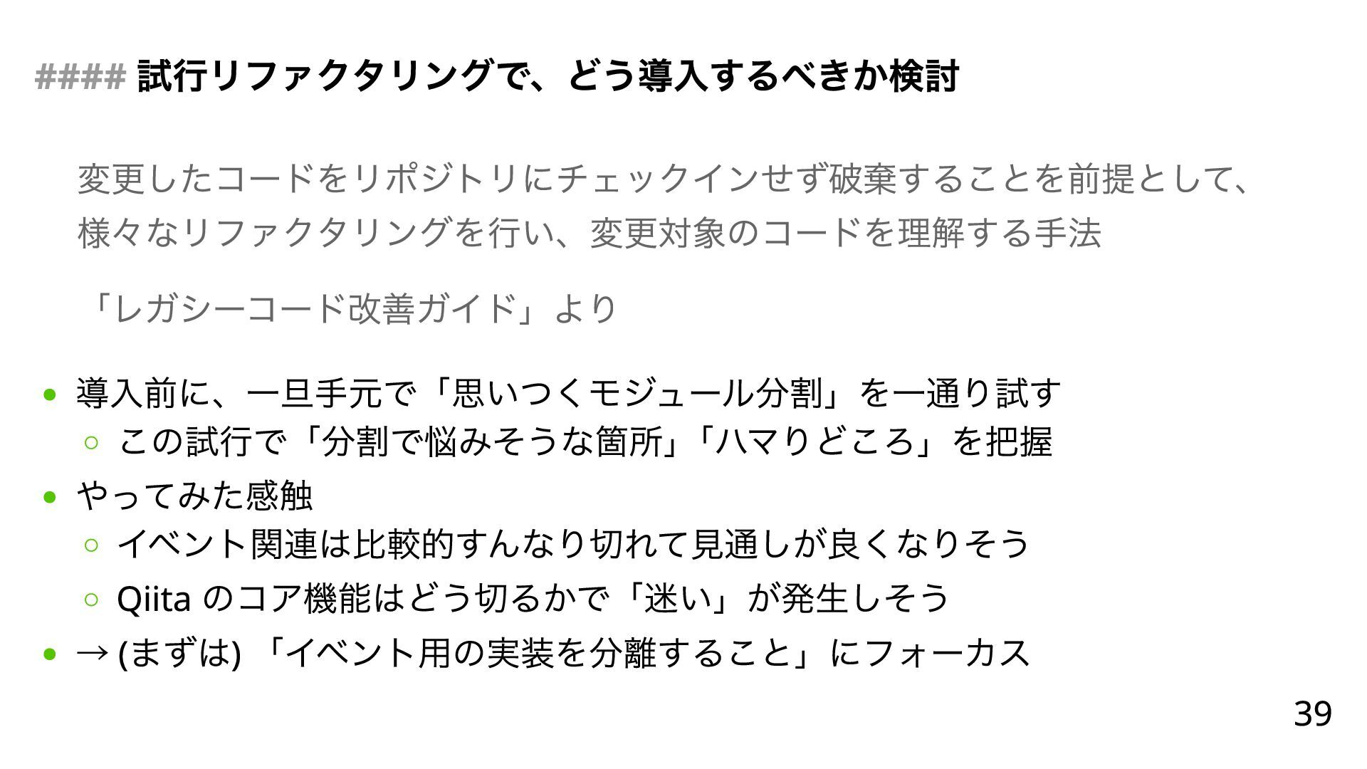 変更したコードをリポジトリにチェックインせず破棄することを前提として、 様々なリファクタリングを行い、変更対象のコードを理解する手法 「レガシーコード改善ガイド」より 導入前に、一旦手元で「思いつくモジュール分割」を一通り試す この試行で「分割で悩みそうな箇所」 「ハマりどころ」を把握 やってみた感触 イベント関連は比較的すんなり切れて見通しが良くなりそう Qiita のコア機能はどう切るかで「迷い」が発生しそう