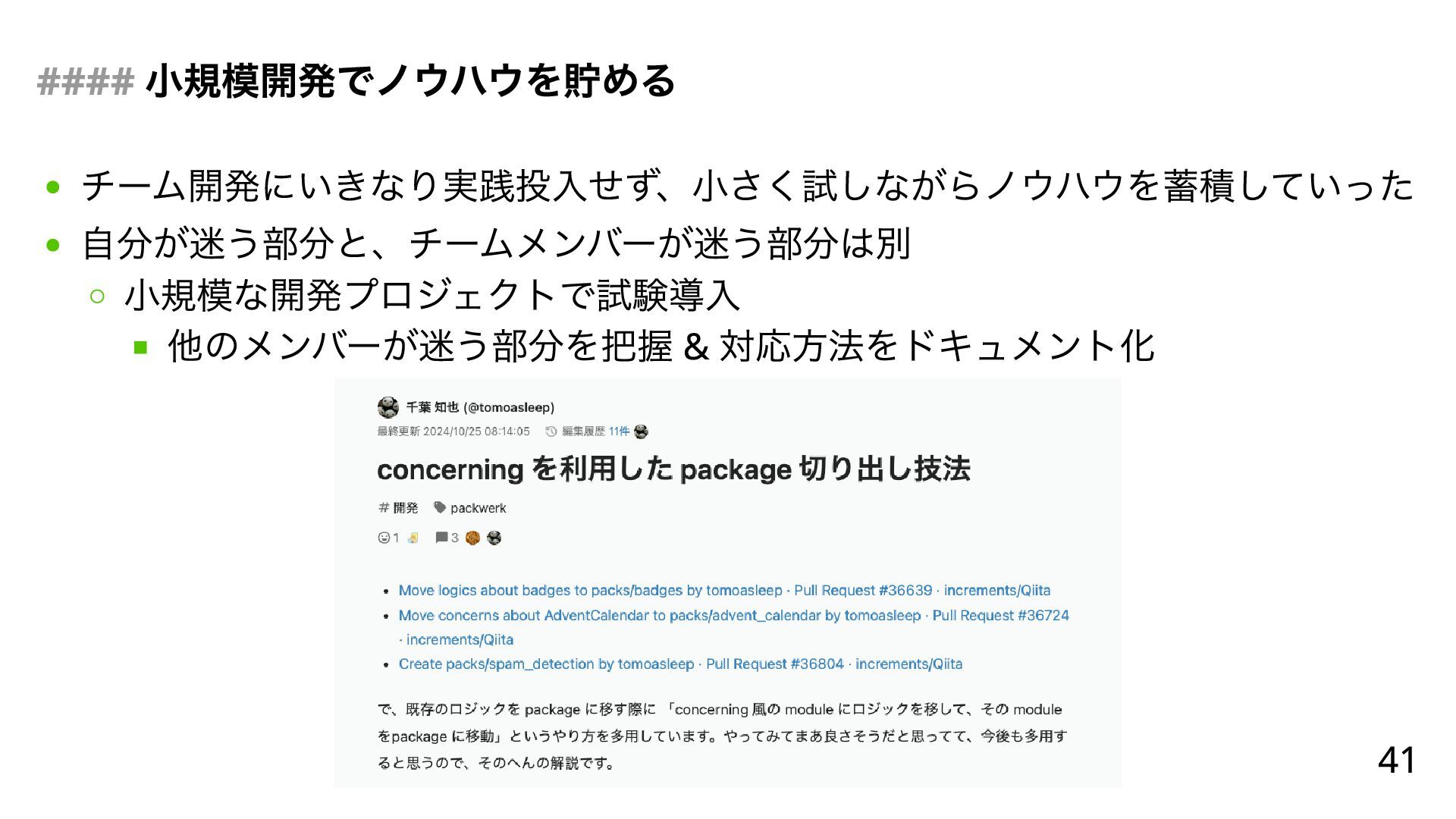 チーム開発にいきなり実践投入せず、小さく試しながらノウハウを蓄積していった 自分が迷う部分と、チームメンバーが迷う部分は別 小規模な開発プロジェクトで試験導入 他のメンバーが迷う部分を把握 & 対応方法をドキュメント化 #### 小規模開発でノウハウを貯める 41