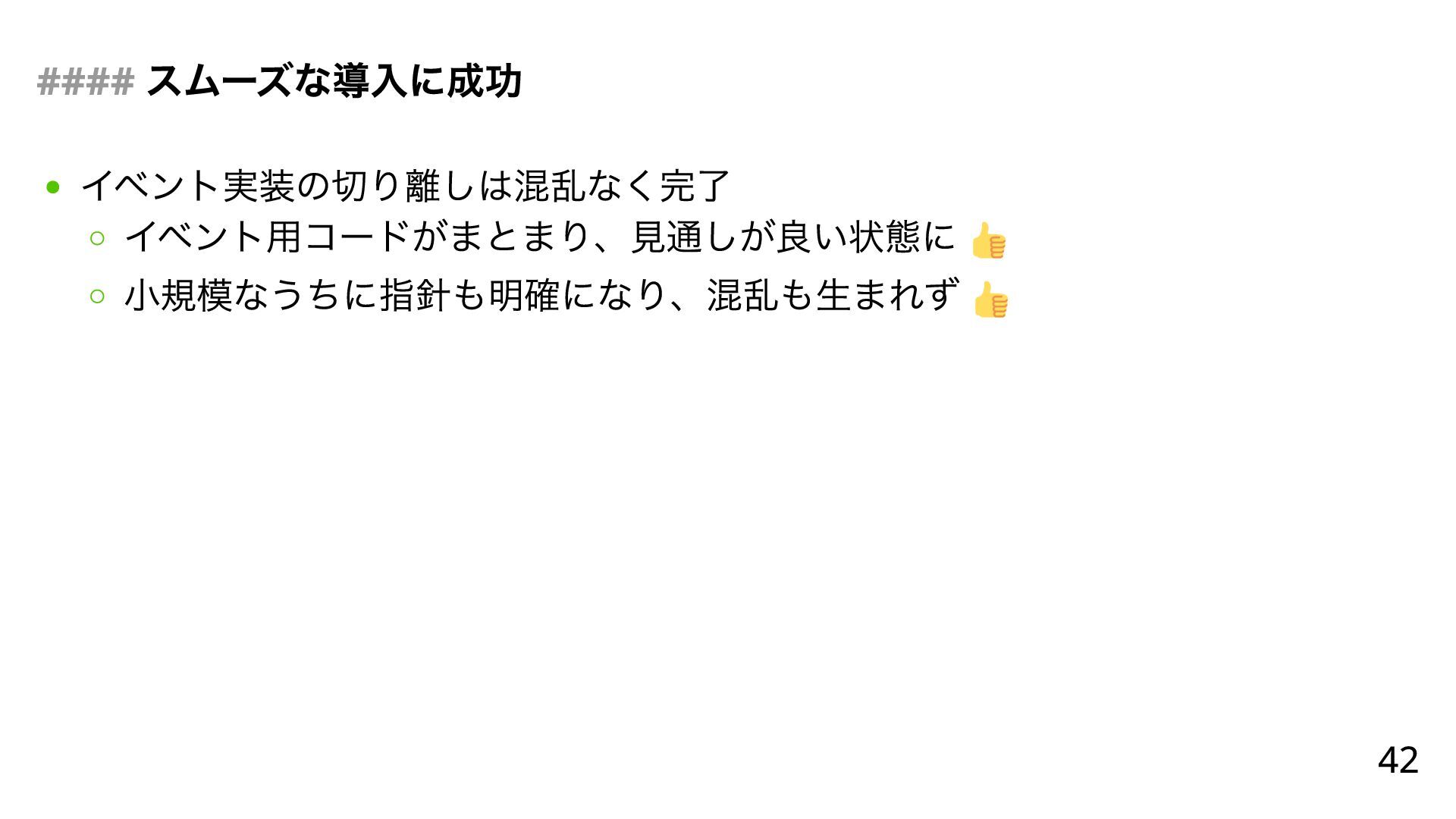 イベント実装の切り離しは混乱なく完了 イベント用コードがまとまり、見通しが良い状態に 小規模なうちに指針も明確になり、混乱も生まれず #### スムーズな導入に成功 42