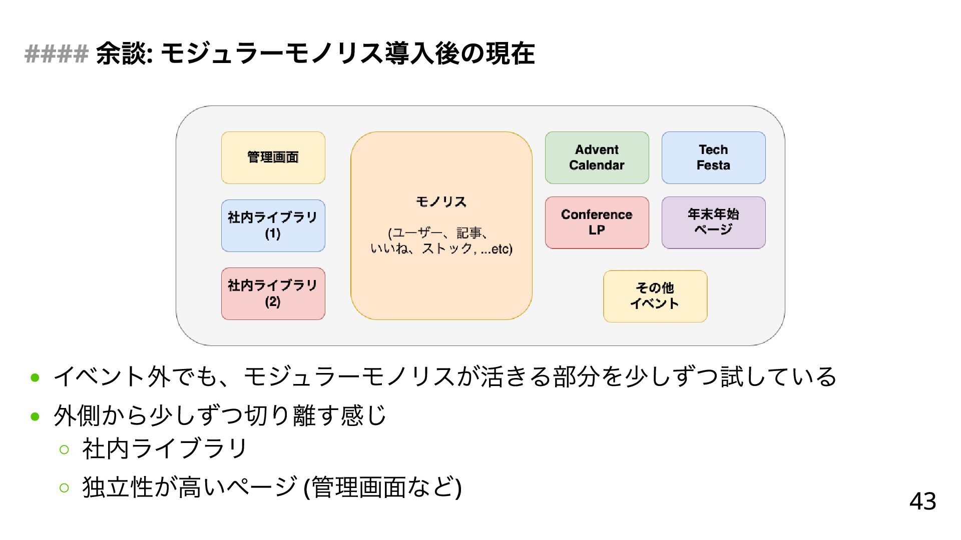 イベント外でも、モジュラーモノリスが活きる部分を少しずつ試している 外側から少しずつ切り離す感じ 社内ライブラリ 独立性が高いページ ( 管理画面など) #### 余談: モジュラーモノリス導入後の現在 43