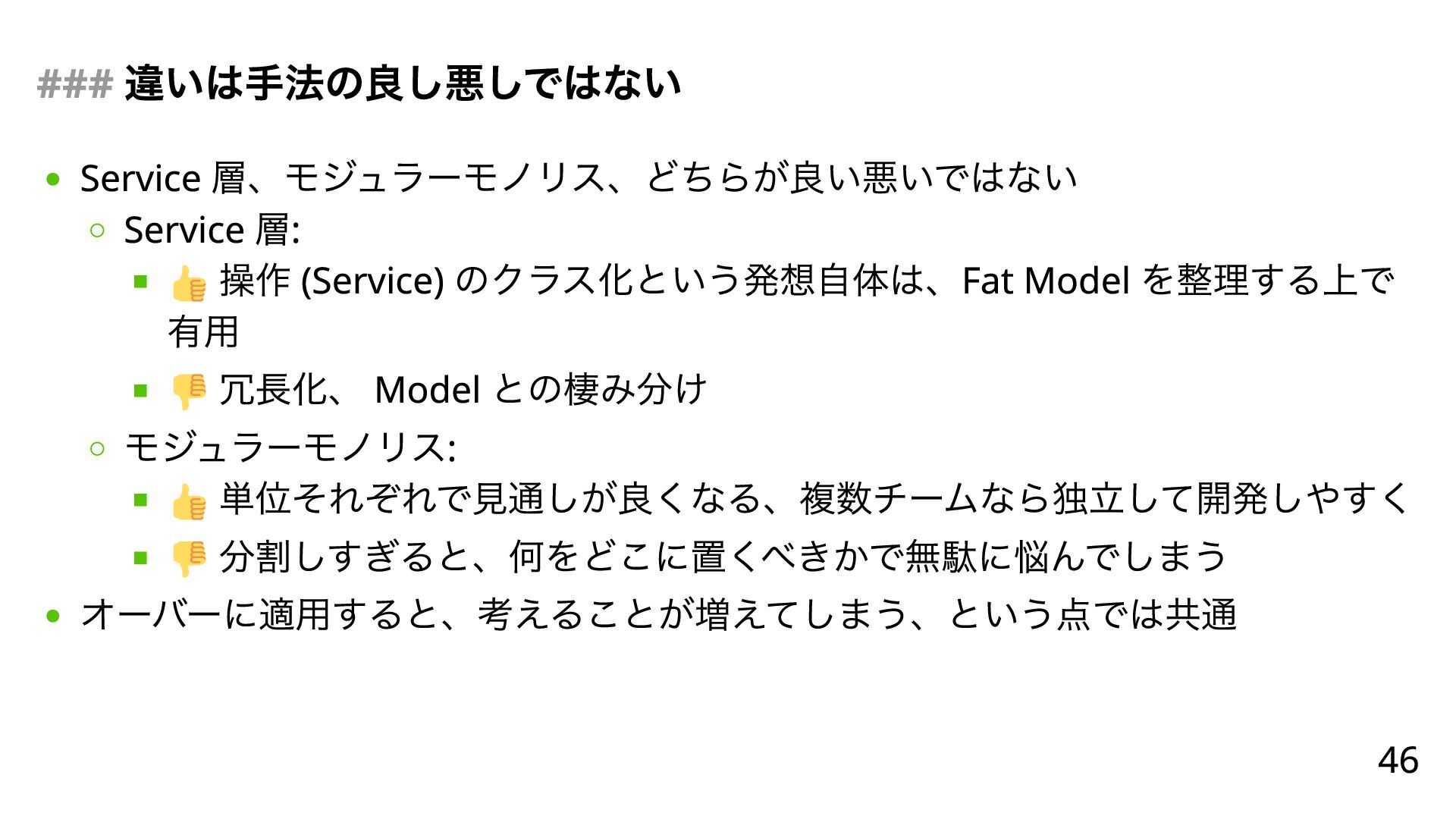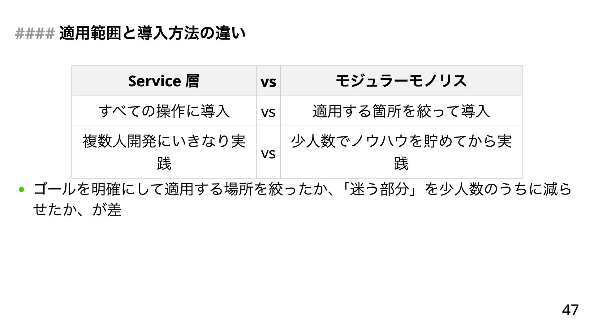 冗長化、 Model との棲み分け モジュラーモノリス: 単位それぞれで見通しが良くなる、複数チームなら独立して開発しやすく 分割しすぎると、何をどこに置くべきかで無駄に悩んでしまう オーバーに適用すると、考えることが増えてしまう、という点では共通 ### 違いは手法の良し悪しではない 46