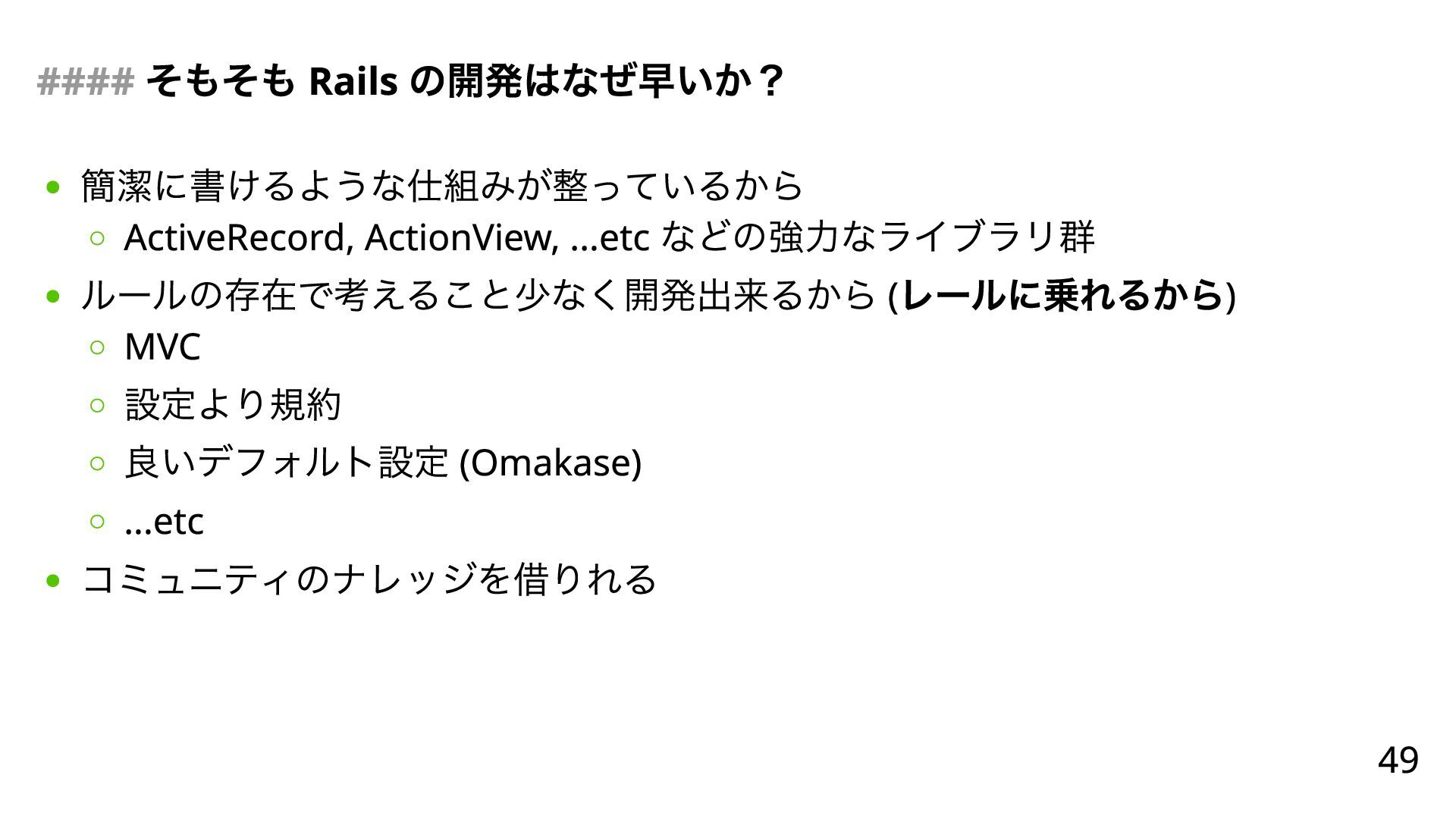 良いデフォルト設定 (Omakase) ...etc コミュニティのナレッジを借りれる #### そもそも Rails の開発はなぜ早いか? 49