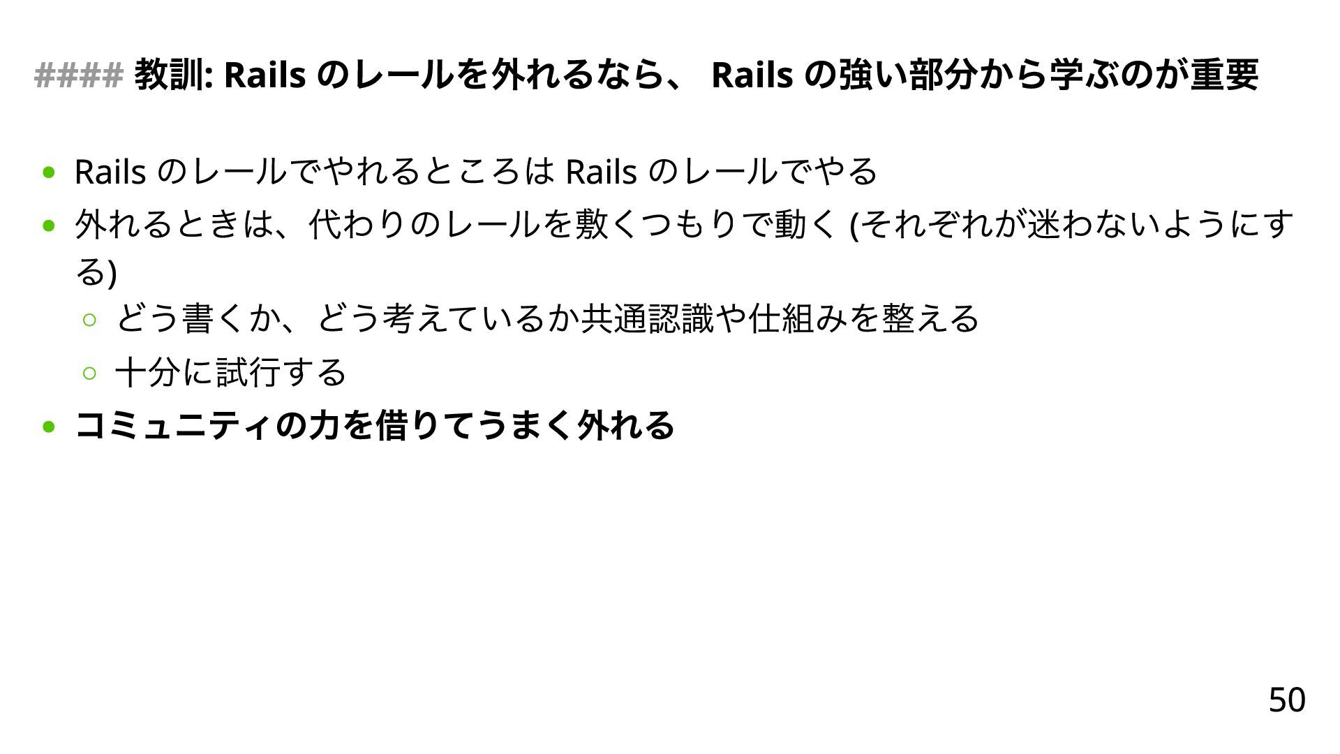 コミュニティの力を借りてうまく外れる #### 教訓: Rails のレールを外れるなら、 Rails の強い部分から学ぶのが重要 50