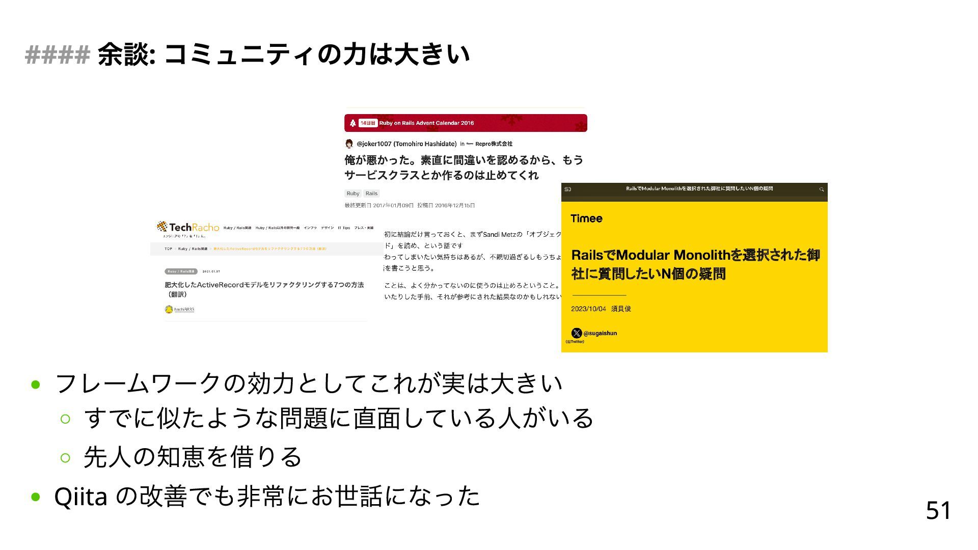 フレームワークの効力としてこれが実は大きい すでに似たような問題に直面している人がいる 先人の知恵を借りる Qiita の改善でも非常にお世話になった #### 余談: コミュニティの力は大きい 51
