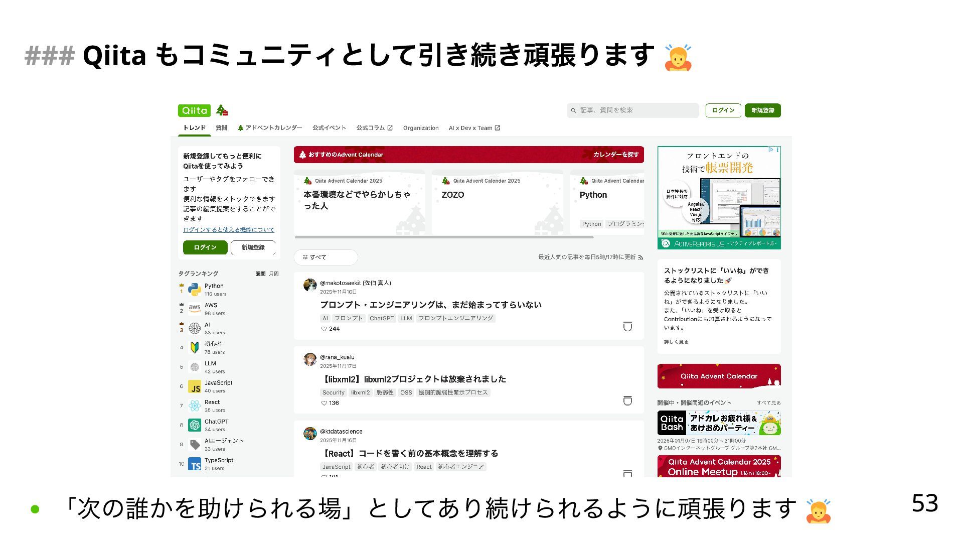 「次の誰かを助けられる場」としてあり続けられるように頑張ります ### Qiita もコミュニティとして引き続き頑張ります 53