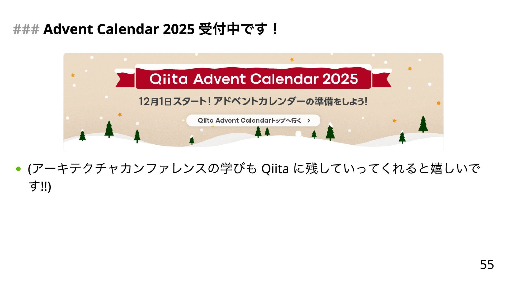 ( アーキテクチャカンファレンスの学びも Qiita に残していってくれると嬉しいで す!!) ### Advent Calendar 2025 受付中です!