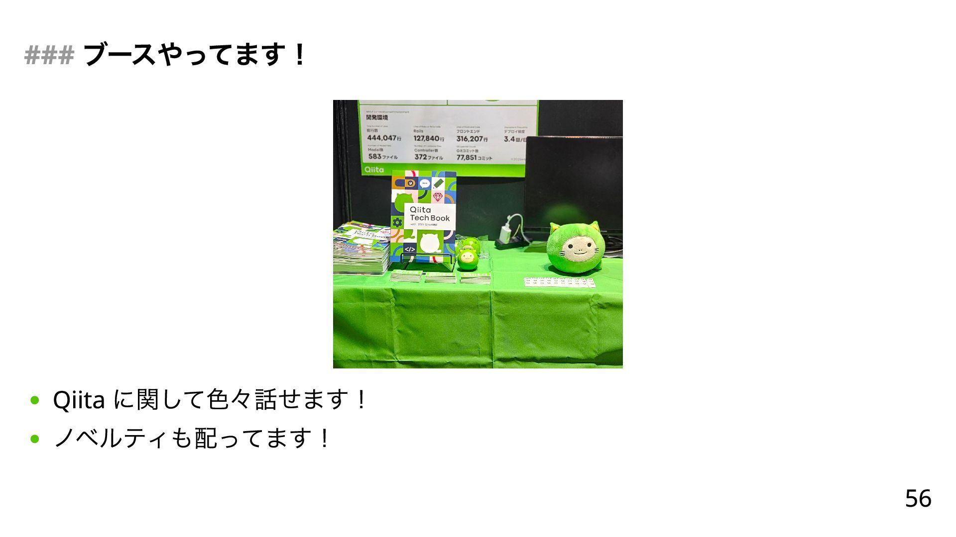 Qiita に関して色々話せます! ノベルティも配ってます! ### ブースやってます! 56