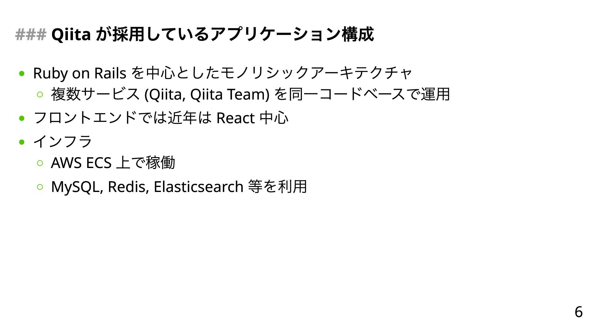 React 中心 インフラ AWS ECS 上で稼働 MySQL, Redis, Elasticsearch 等を利用 ### Qiita が採用しているアプリケーション構成 6