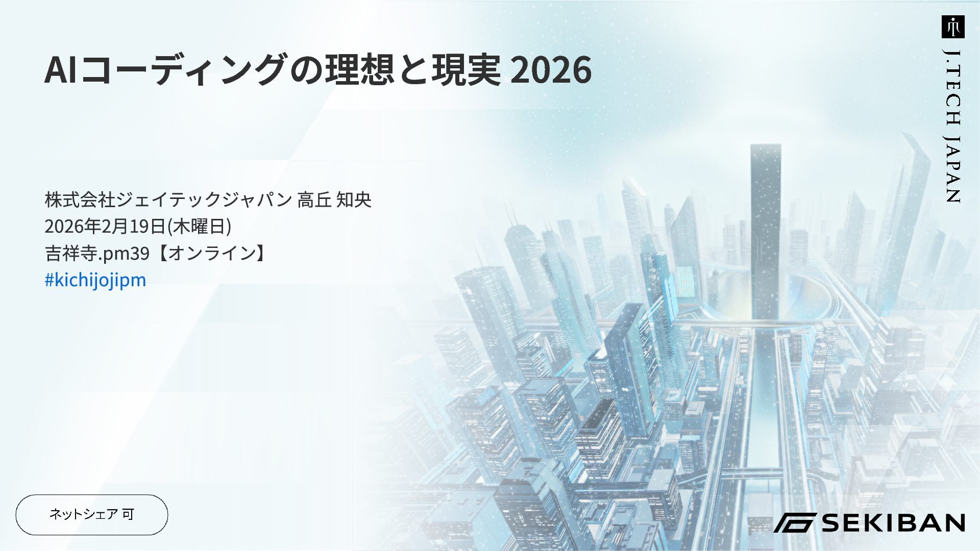 2026年2月19日 吉祥寺.pm39 にて発表。前回(2025年4月)の続編として、リアルタイムアンケートで1年間の変化を定点観測しながら「AIコーディングで私たちは本当に幸せ