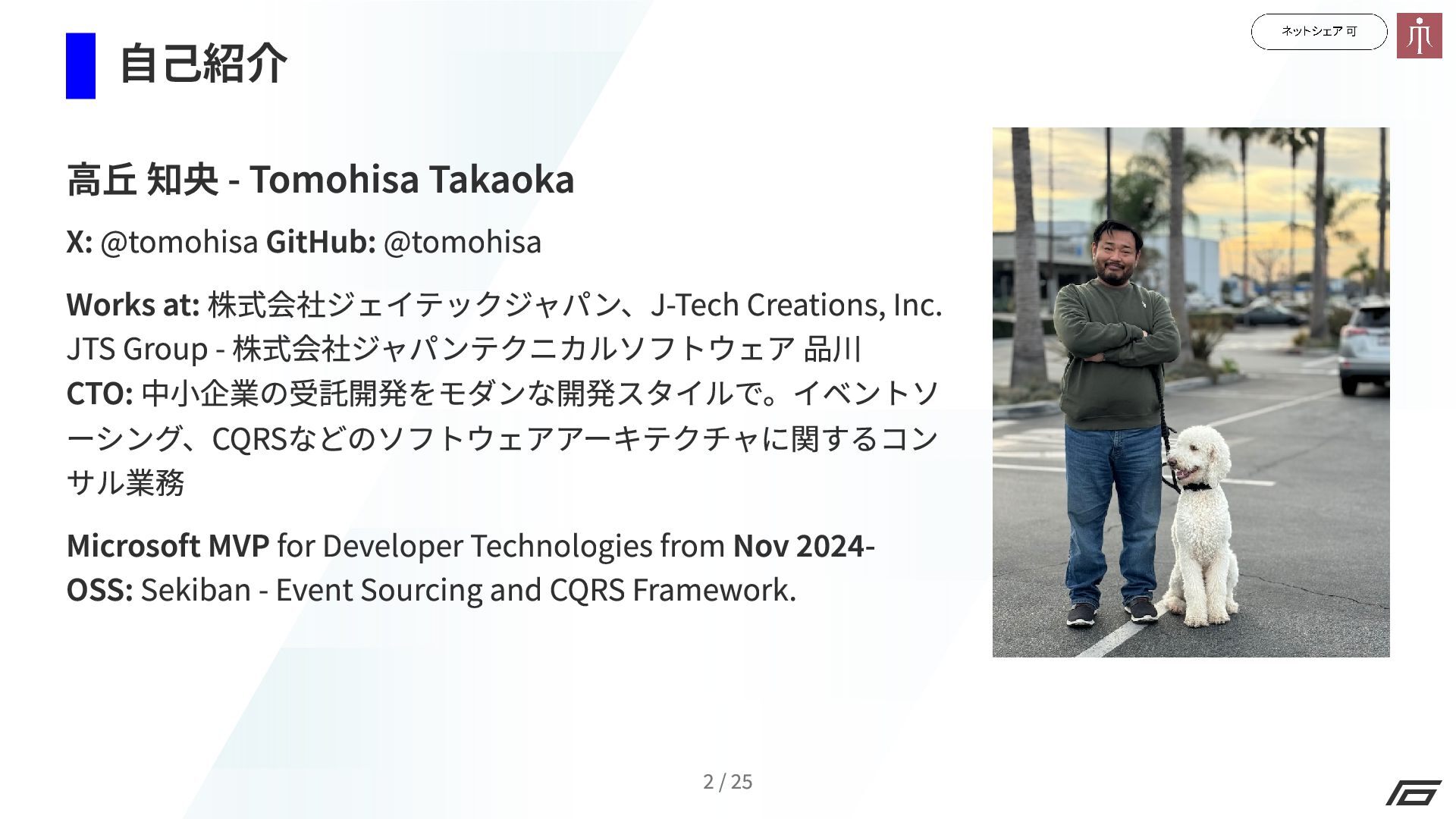 Works at: 株式会社ジェイテックジャパン、J-Tech Creations, Inc. JTS Group - 株式会社ジャパンテクニカルソフトウェア 品川 CTO: 中小企業の受託開発をモダンな開発スタイルで。イベントソ ーシング、CQRSなどのソフトウェアアーキテクチャに関するコン サル業務 Microsoft MVP for Developer Technologies from Nov 2024- OSS: Sekiban - Event Sourcing and CQRS Framework. 2 / 25