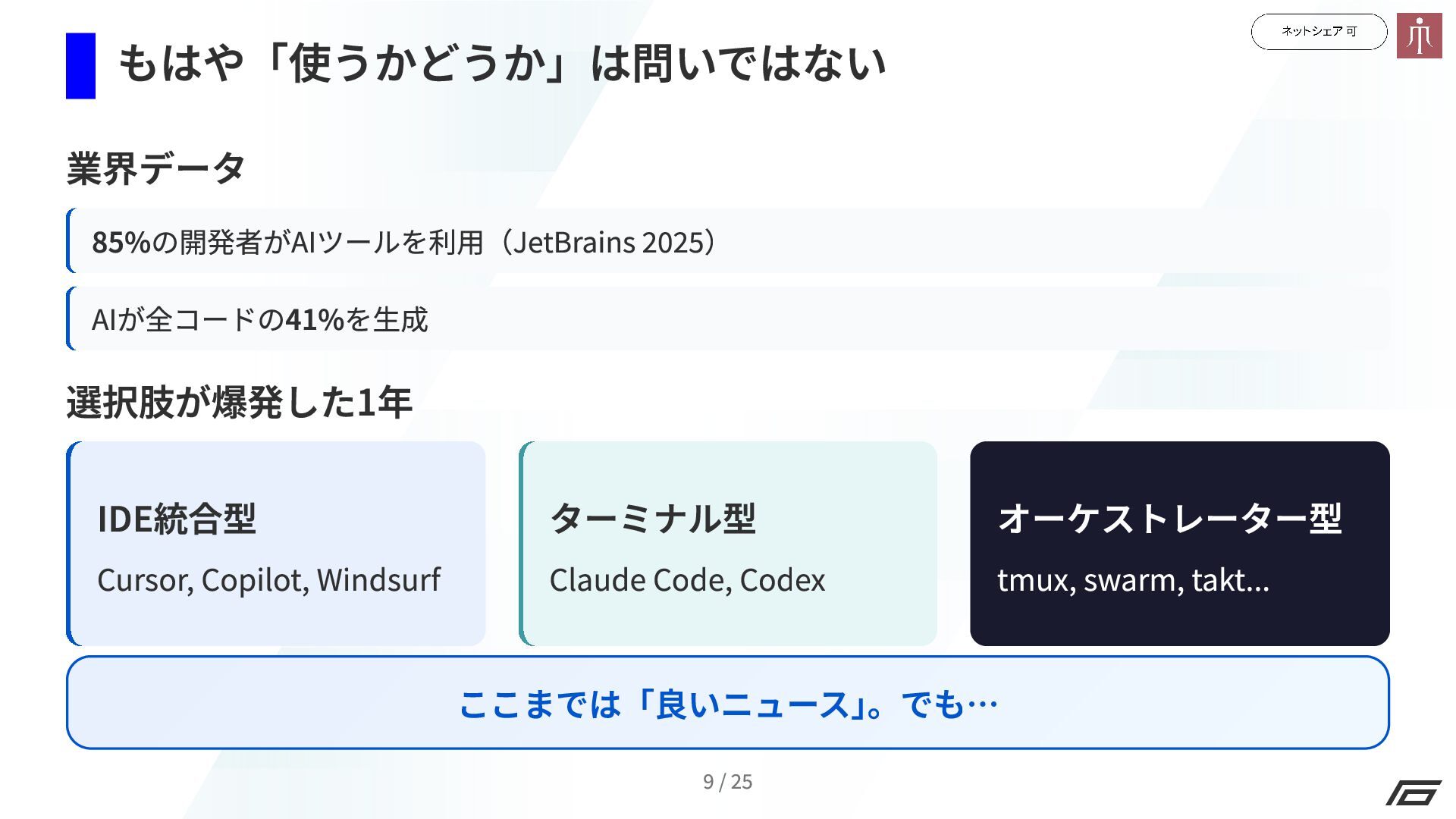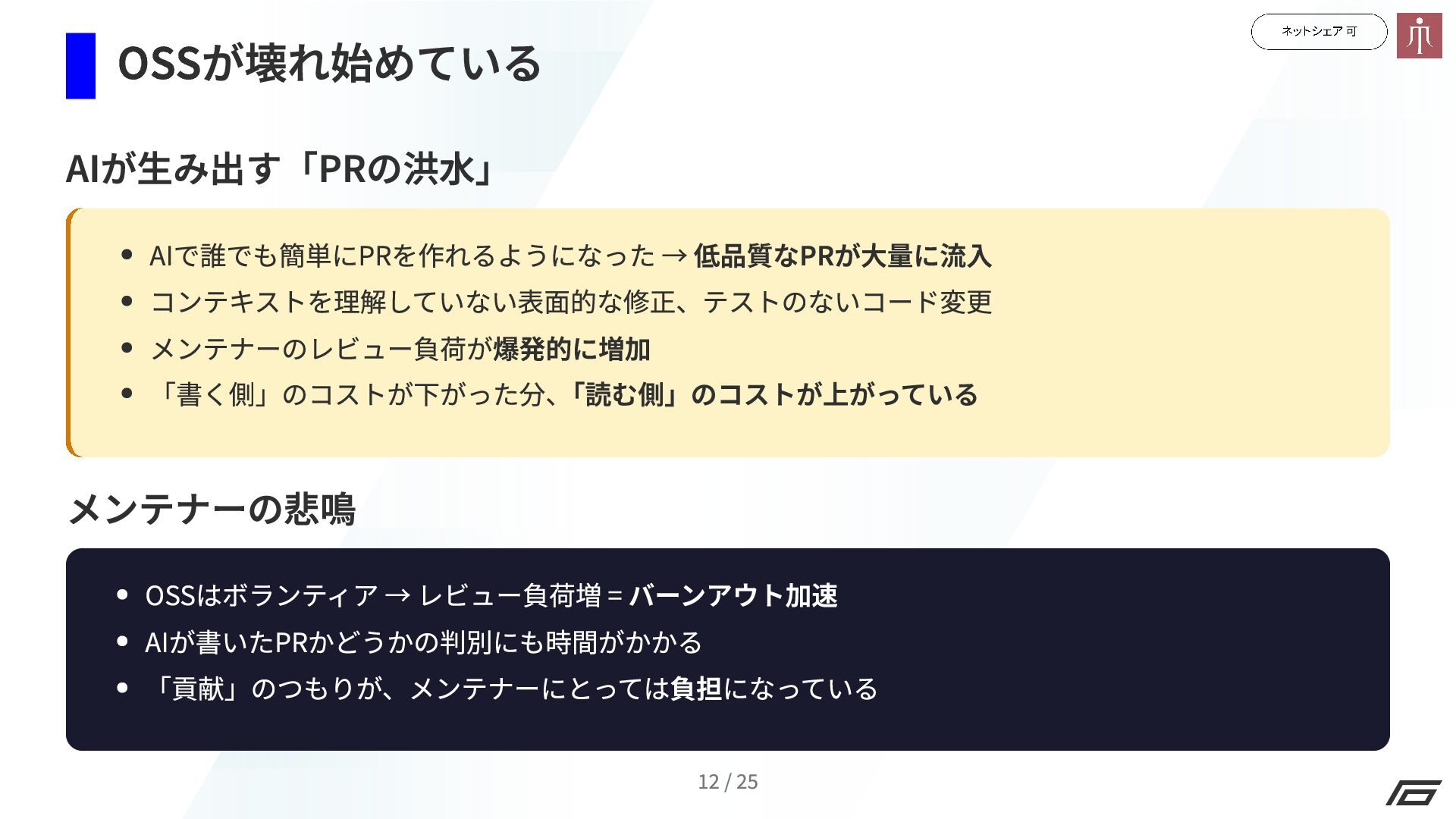 → 残りは読んで、試して、捨てる時間 経験者はAI導入後、コードレビュー時間が19%増加 UC Berkeley研究: AIで効率は上がるが仕事量も同時に増え、労働時間は減らない 「もっとできるはず」→ タスクを増やす → トータルの作業時間はむしろ増加 AIの出力確認・修正・テストに想定以上の時間を消費 → 働きすぎに気づけない 11 / 25