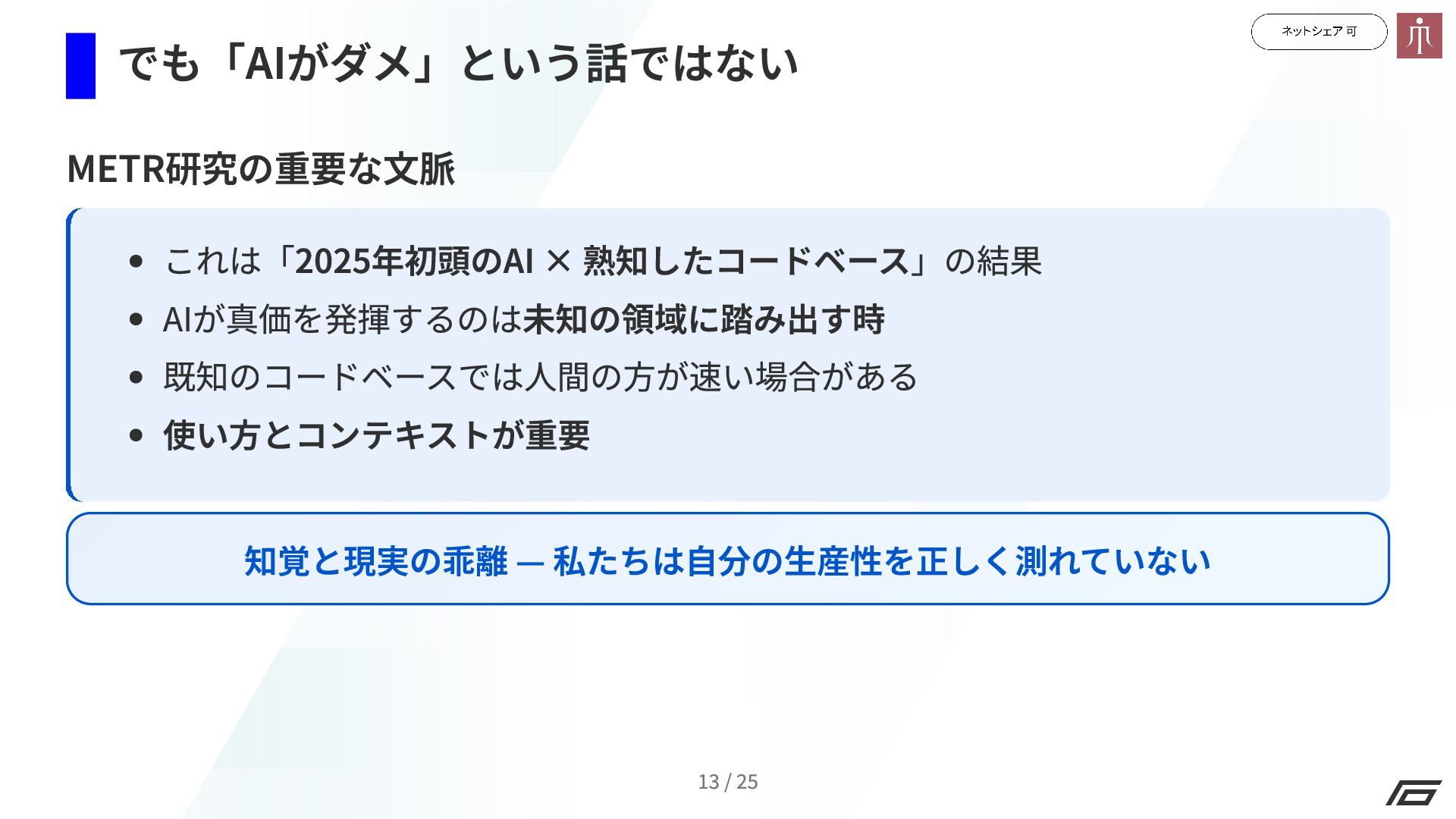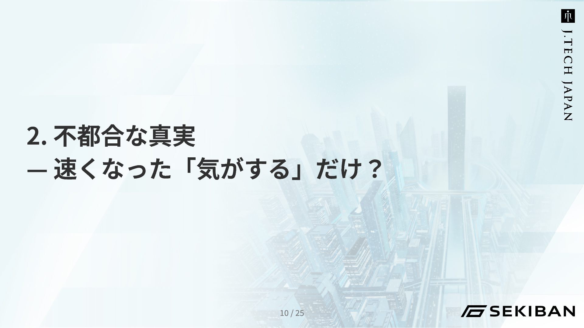 2. 不都合な真実 — METR研究では「体感+20%速くなった」のに「実際は19%遅くなっていた」。AIで効率は上がるが仕事量も増え、トータルの作業時間はむしろ増加する問題