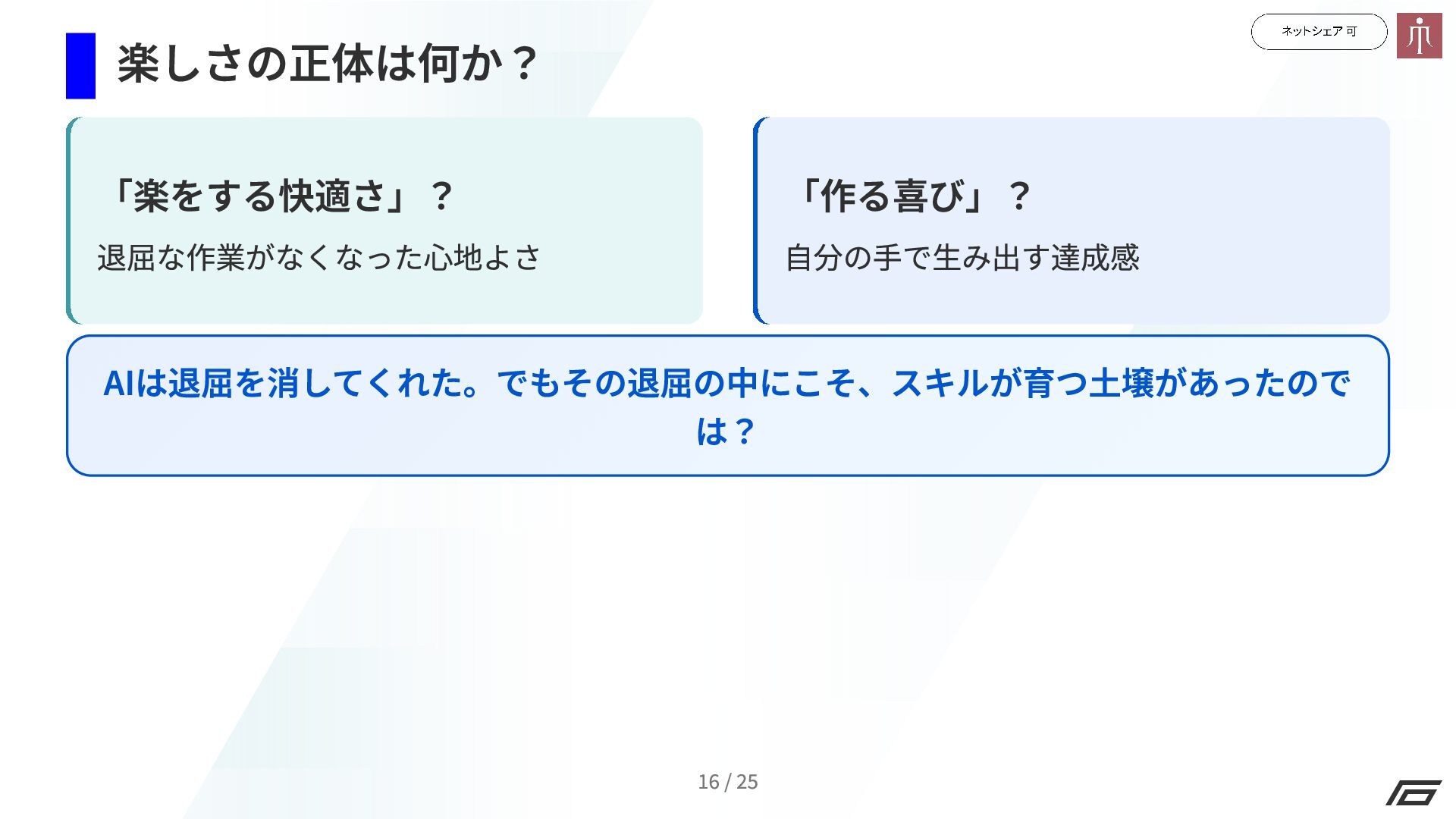 影: 見えてきた問題 スキル萎縮: AI無しでサイドプロジェクトを 始めたら「自分がバカに感じた」 「コーディングエージェントなしでは書けな い身体になった」 45%が「AIコードのデバッグは自力より時 間がかかる」 「作る人」から「チェックする人」への変 質 15 / 25