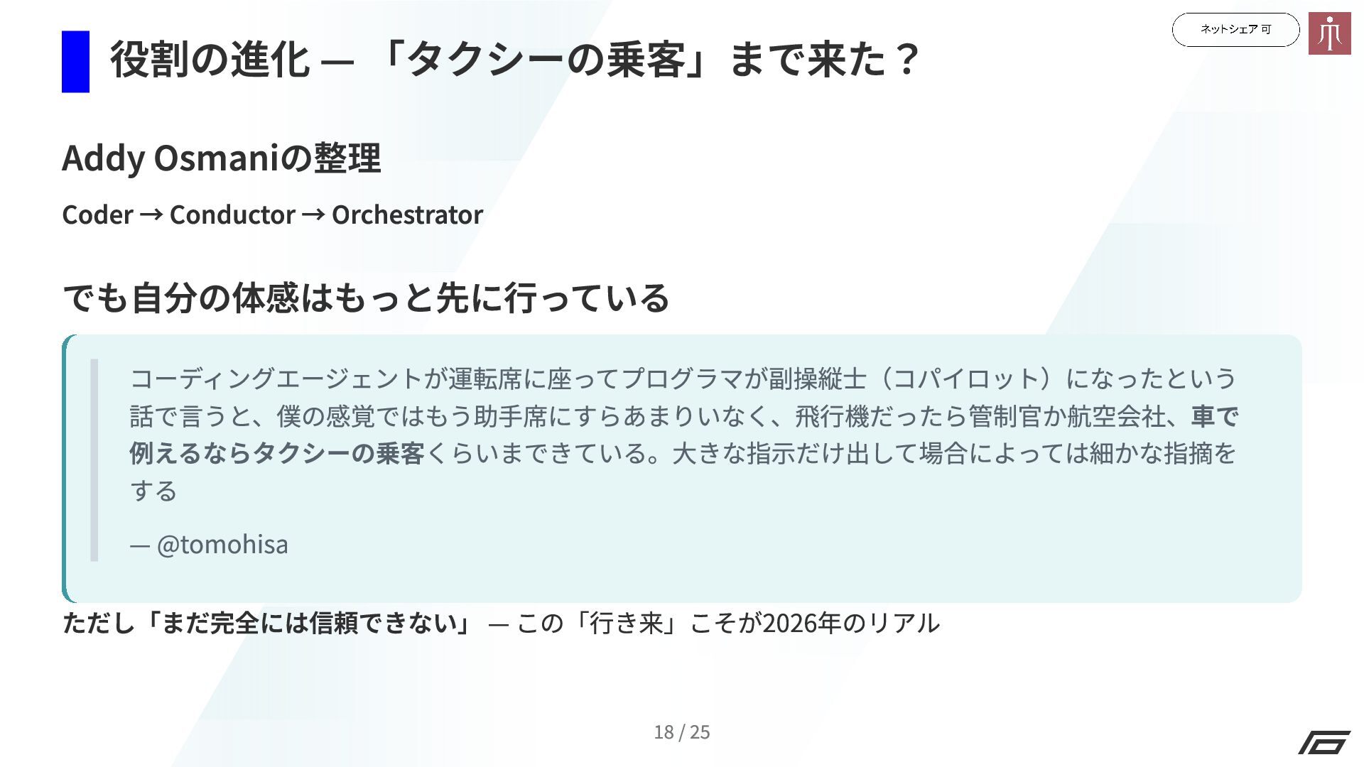 でも自分の体感はもっと先に行っている コーディングエージェントが運転席に座ってプログラマが副操縦士(コパイロット)になったという 話で言うと、僕の感覚ではもう助手席にすらあまりいなく、飛行機だったら管制官か航空会社、車で 例えるならタクシーの乗客くらいまできている。大きな指示だけ出して場合によっては細かな指摘を する — @tomohisa ただし「まだ完全には信頼できない」 — この「行き来」こそが2026年のリアル 18 / 25