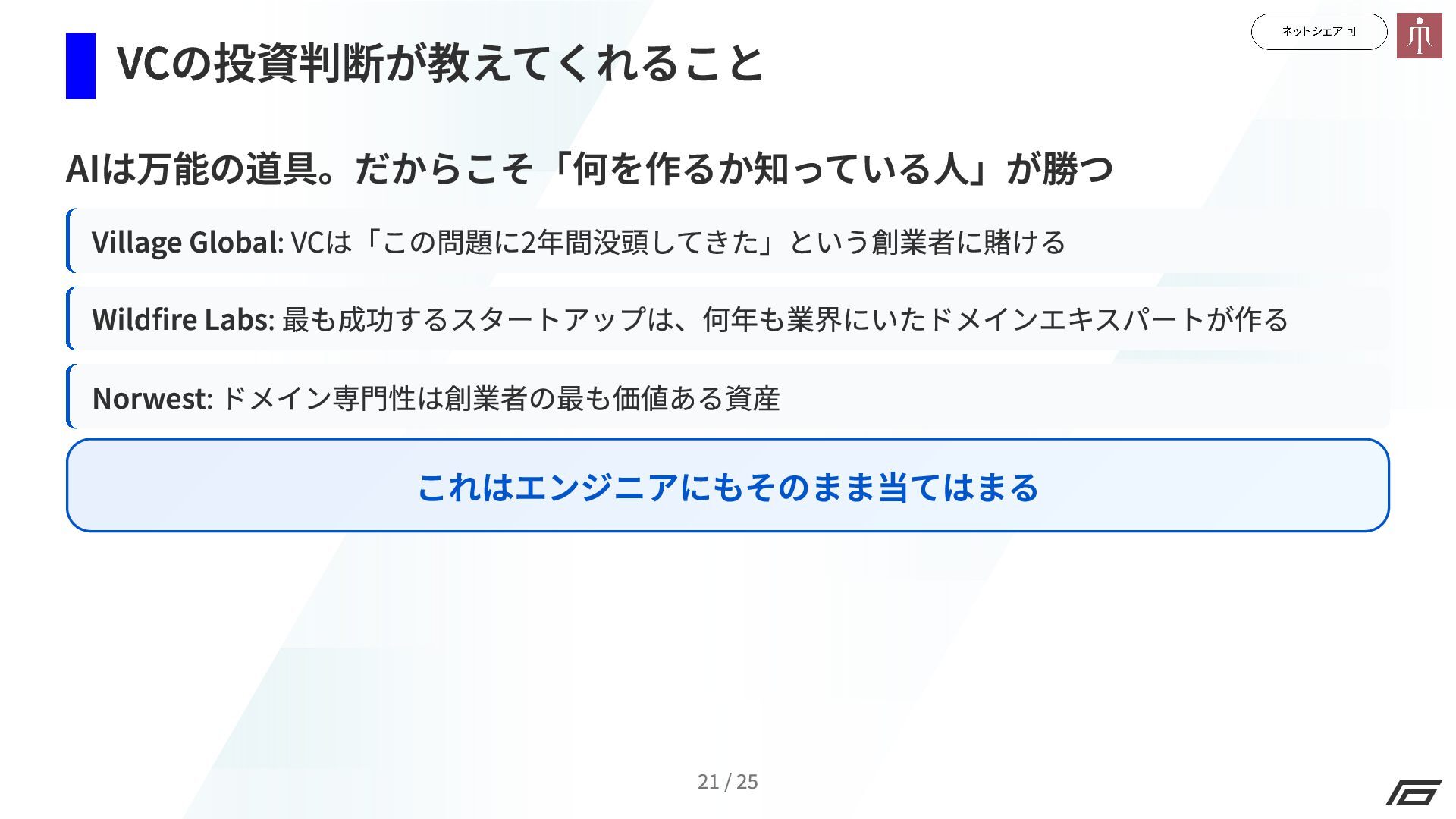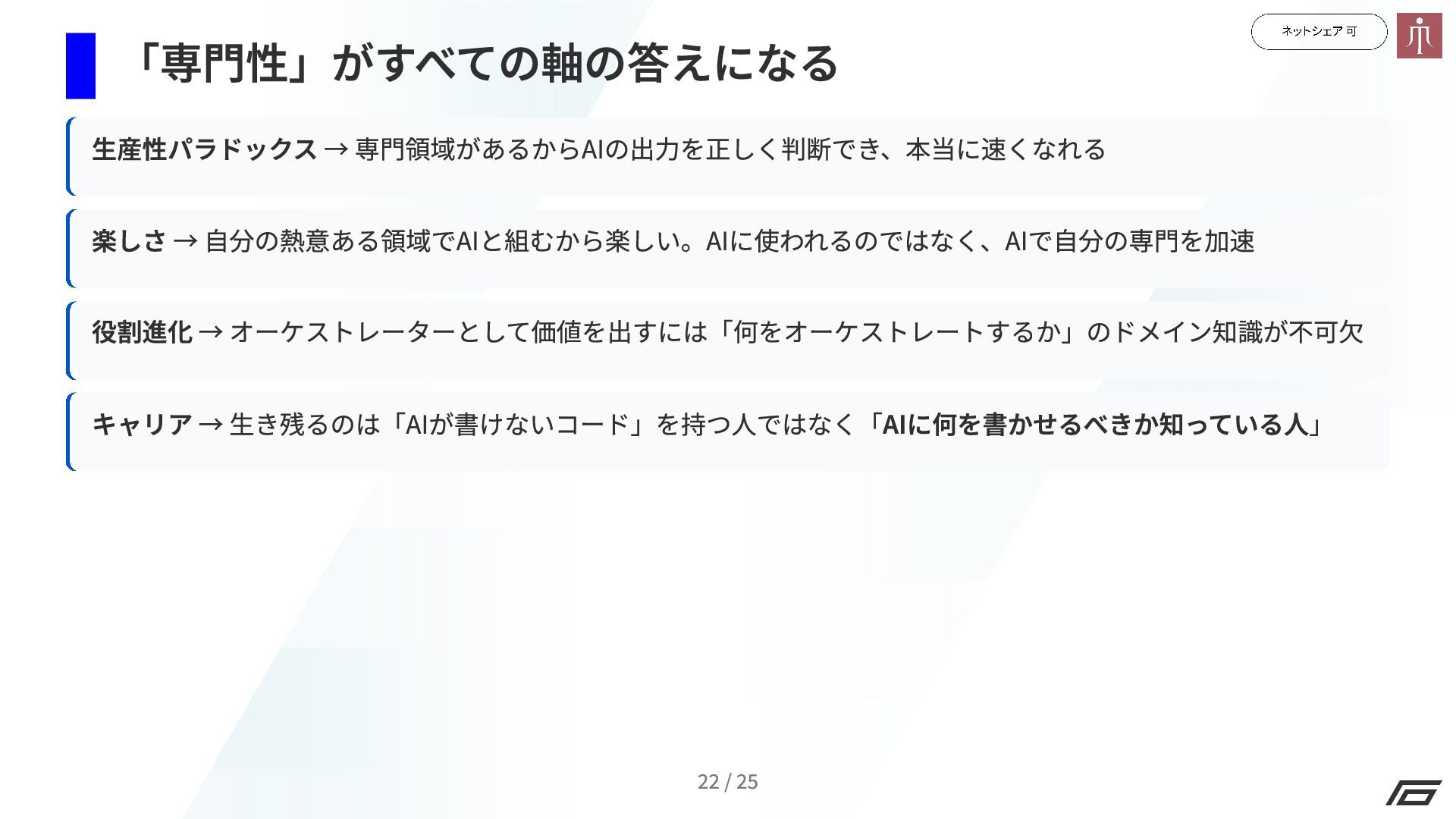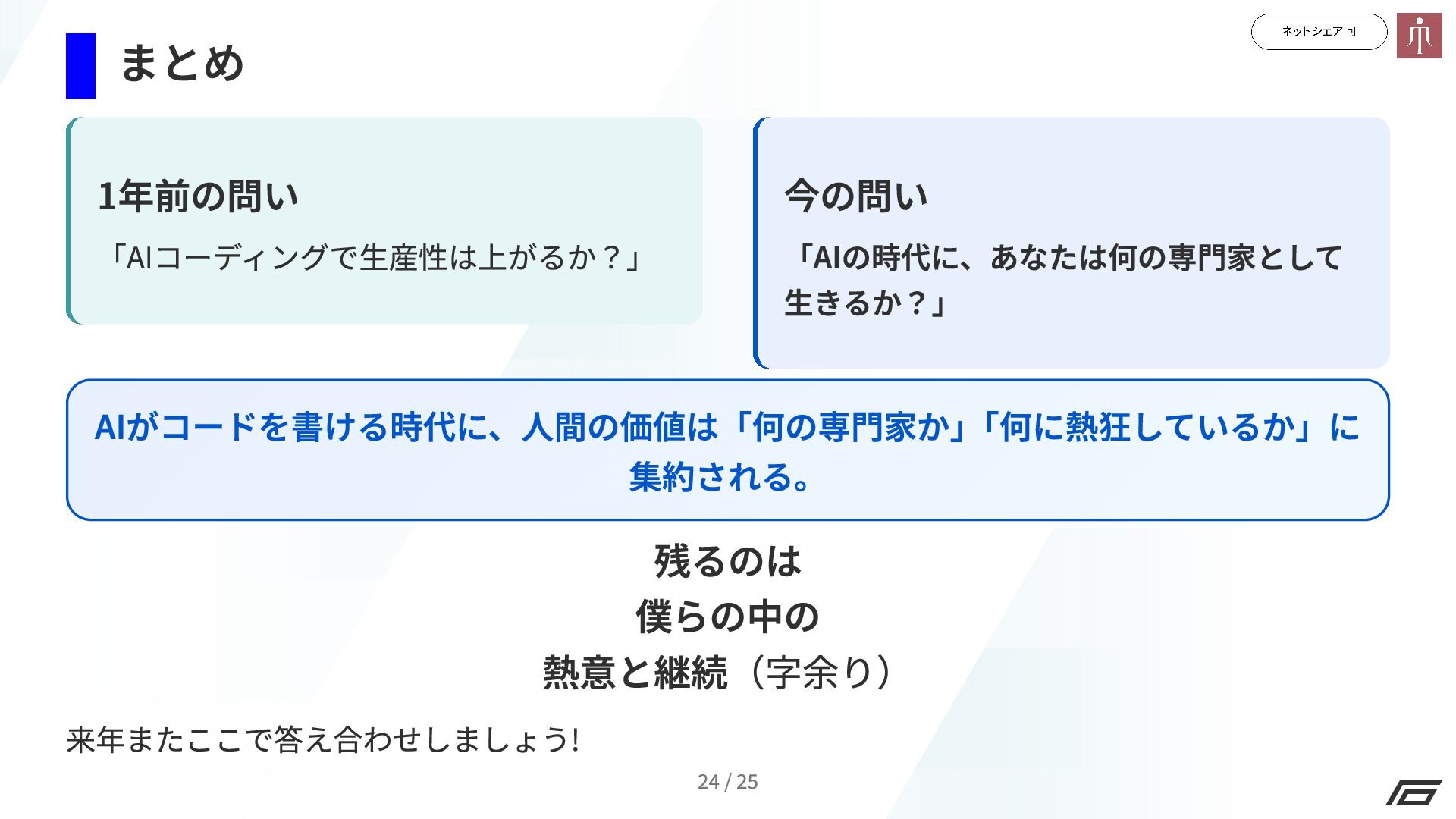なぜその設計判断をするか理解している ドメインの文脈がわかる トレードオフを評価できる → 人間の価値が残る場所 23 / 25