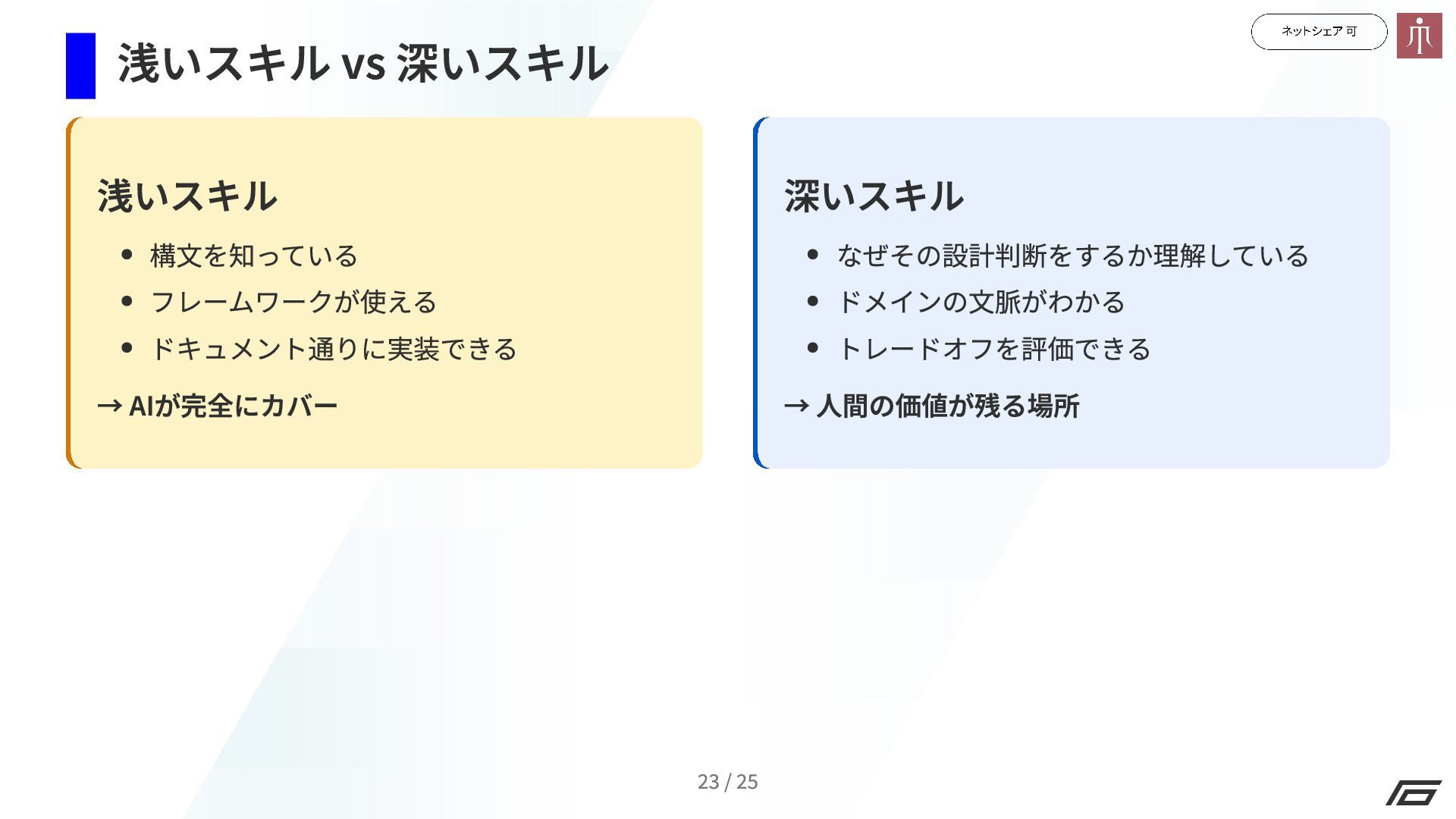 10. 浅いスキル vs 深いスキル 浅いスキル 構文を知っている フレームワークが使える ドキュメント通りに実装できる → AIが完全にカバー 深いスキル