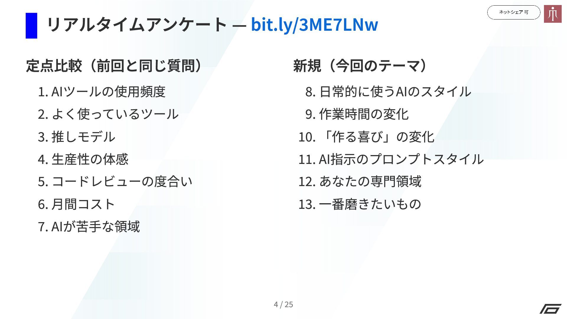 4. 生産性の体感 5. コードレビューの度合い 6. 月間コスト 7. AIが苦手な領域 新規(今回のテーマ) 8. 日常的に使うAIのスタイル 9. 作業時間の変化 10. 「作る喜び」の変化 11. AI指示のプロンプトスタイル 12. あなたの専門領域 13. 一番磨きたいもの 4 / 25