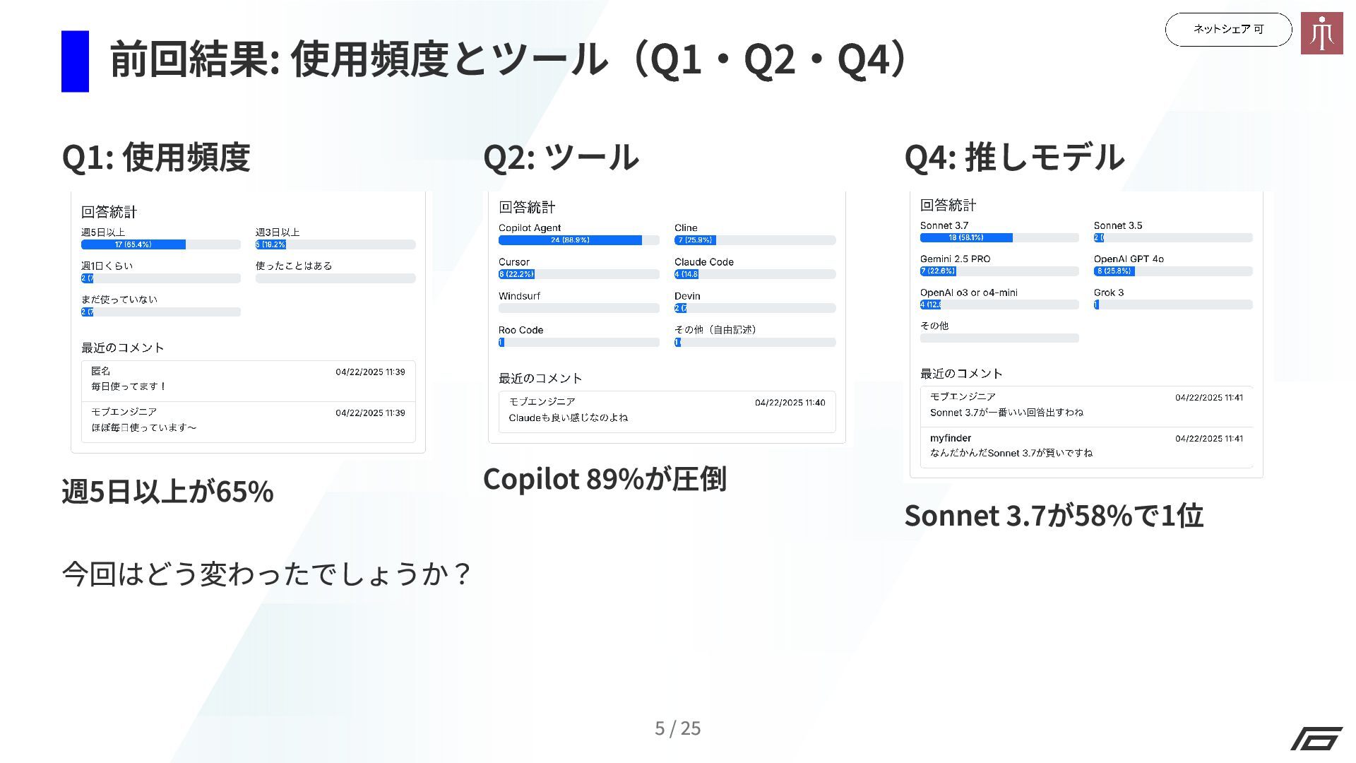 4. 前回結果: 使用頻度とツール(Q1・Q2・Q4) Q1: 使用頻度 週5日以上が65% Q2: ツール Copilot 89%が圧倒 Q4: