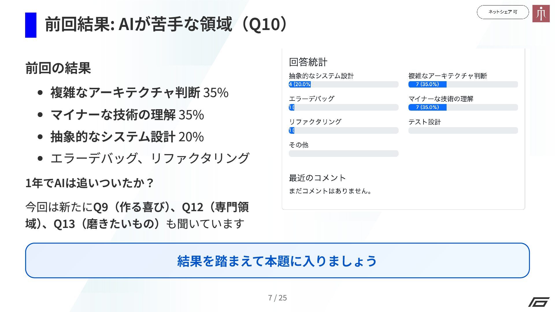 1年でAIは追いついたか? 今回は新たにQ9(作る喜び) 、Q12(専門領 域) 、Q13(磨きたいもの)も聞いています 結果を踏まえて本題に入りましょう 7 / 25