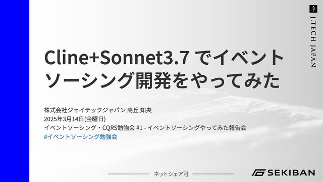 概要: 今年に入ってLLMにアシストされたプログラミングツールが話題になっています。特に2025年2月25日に発表されたAnthropic Claude Sonnet 3.7とClineを始めとするプログラミングエージェントによるコーディングアシスト機能は、それまでのコーディング体験を大きく変えるものとなっています。この発表ではイベントソーシングがLLMプログラミング時代に向いている理由や、実際にC#のイベントソーシングフレームワークをCline+Sonnet3.7で行った開発体験などをお話しします。
