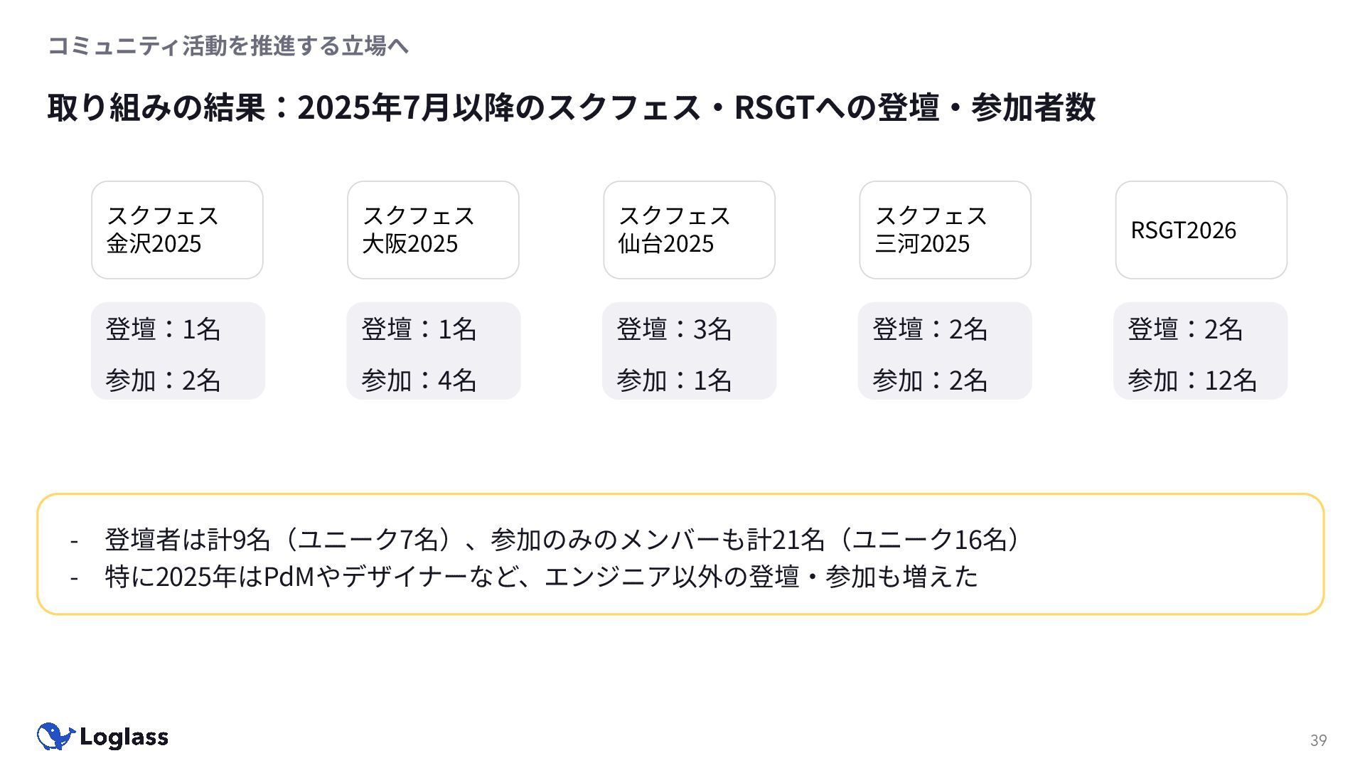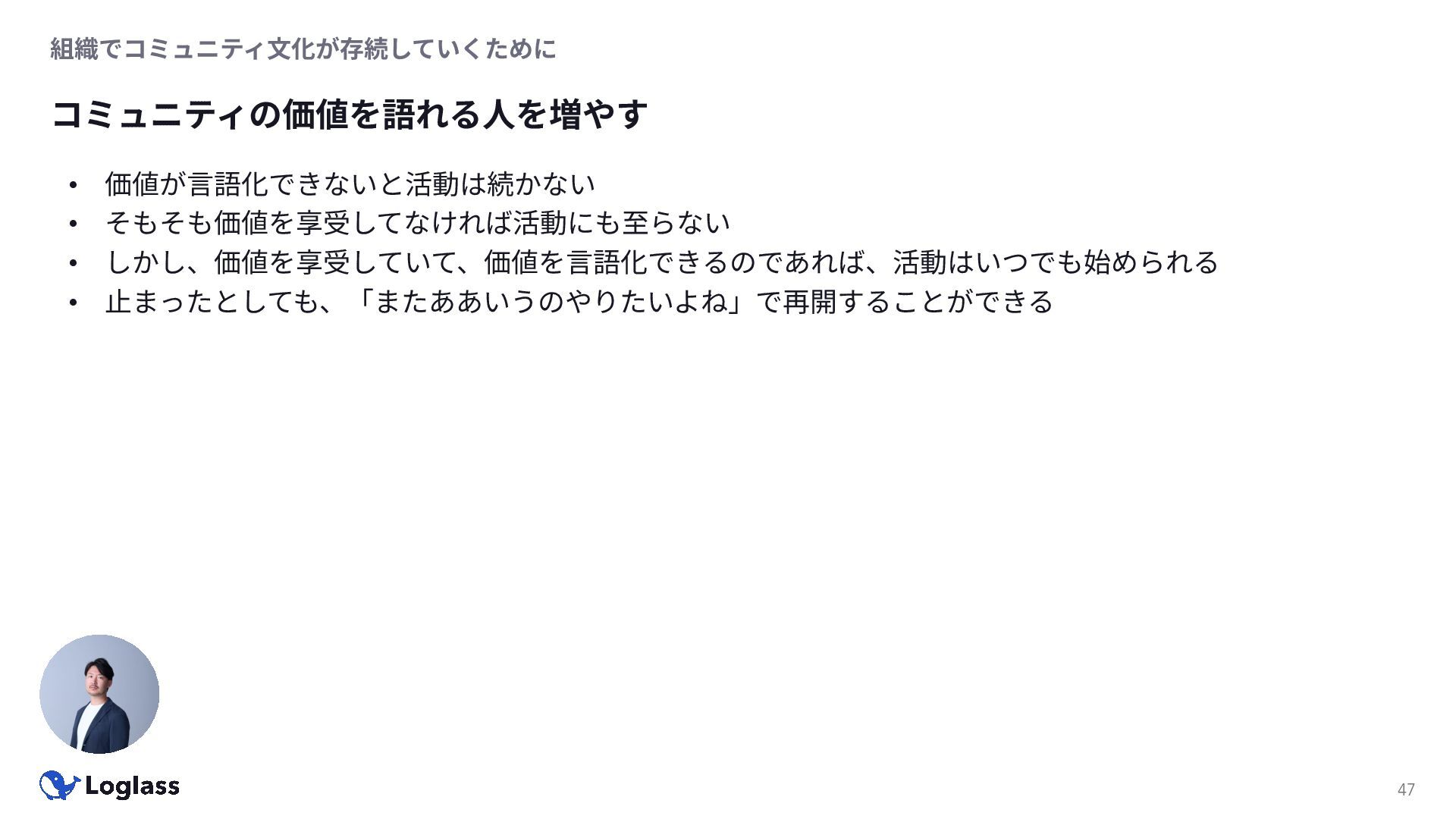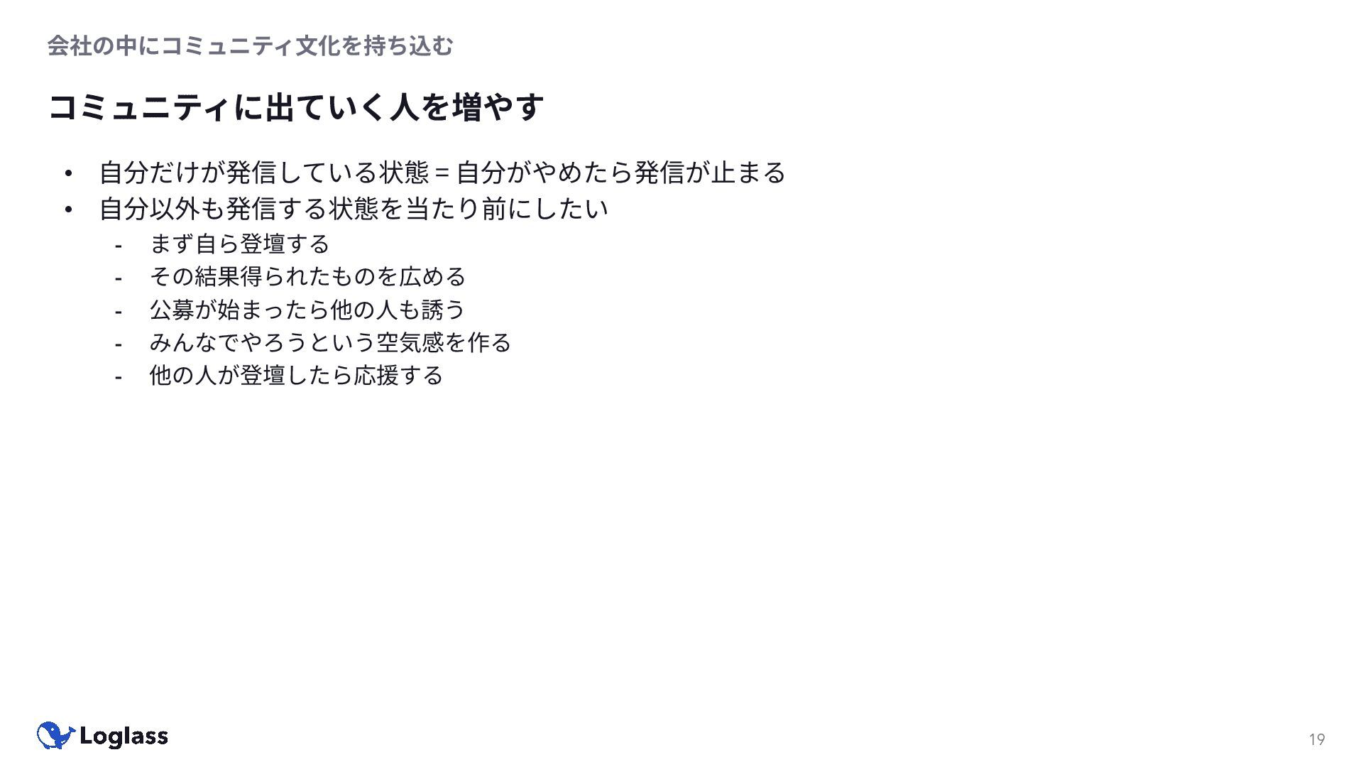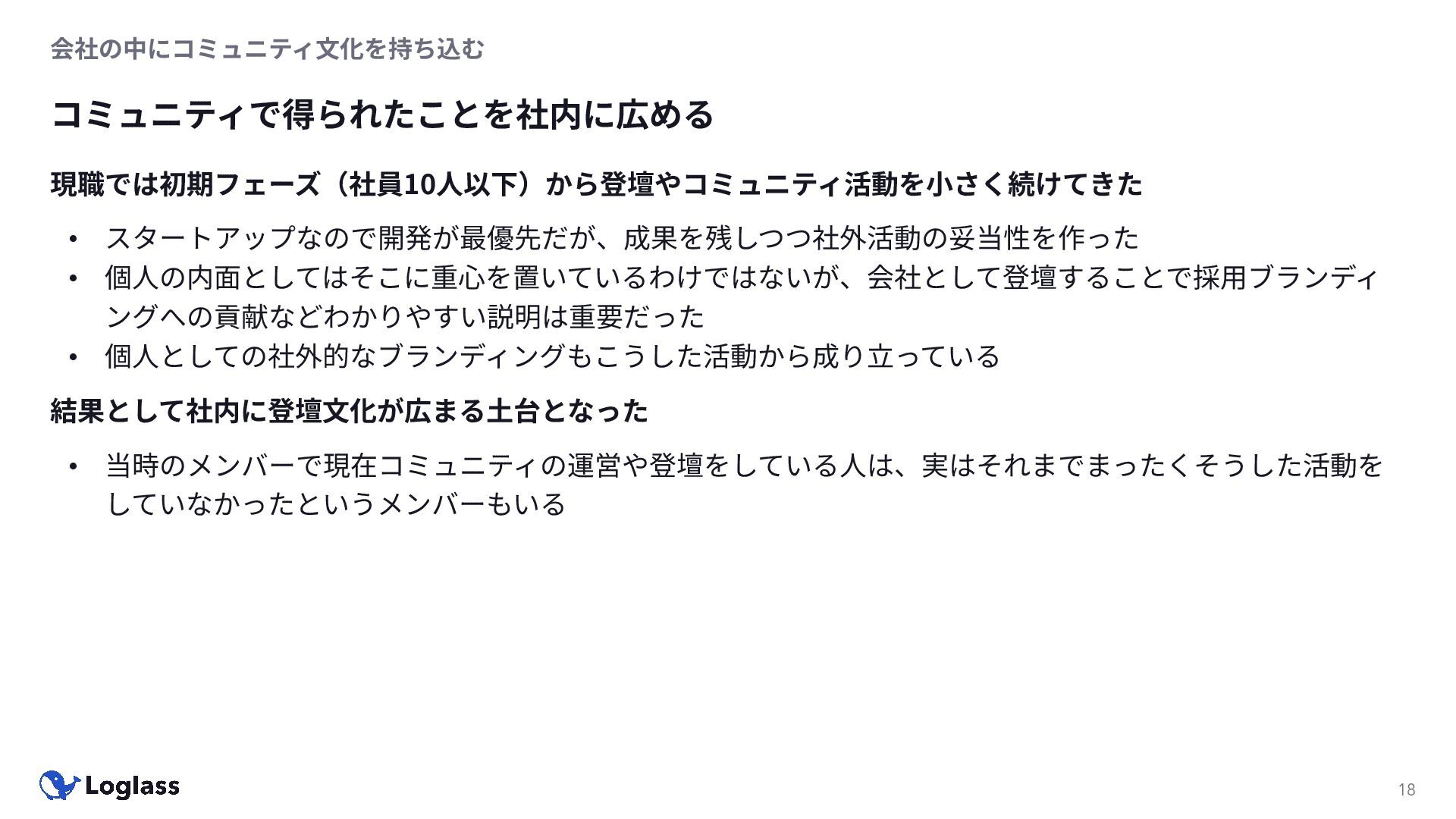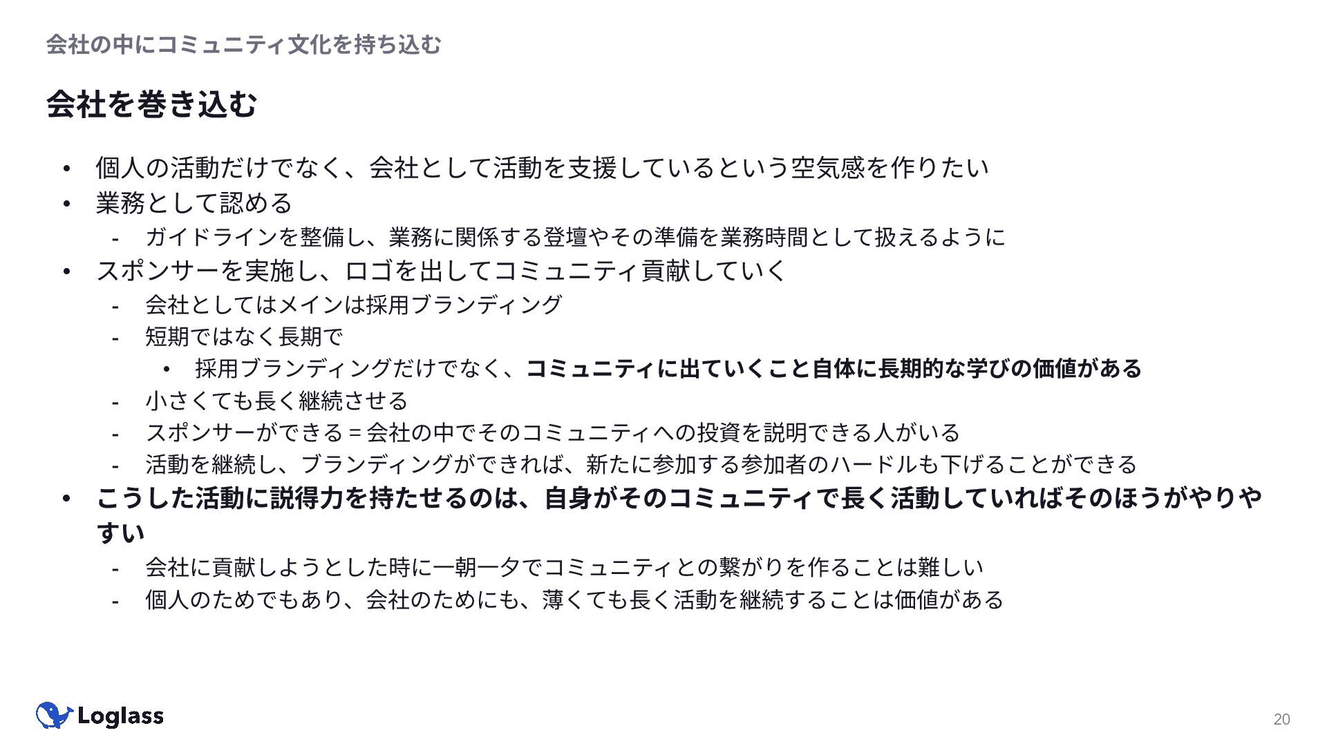 ‐ 短期ではなく⻑期で • 採⽤ブランディングだけでなく、コミュニティに出ていくこと⾃体に⻑期的な学びの価値がある ‐ ⼩さくても⻑く継続させる ‐ スポンサーができる = 会社の中でそのコミュニティへの投資を説明できる⼈がいる ‐ 活動を継続し、ブランディングができれば、新たに参加する参加者のハードルも下げることができる • こうした活動に説得⼒を持たせるのは、⾃⾝がそのコミュニティで⻑く活動していればそのほうがやりや すい ‐ 会社に貢献しようとした時に⼀朝⼀⼣でコミュニティとの繋がりを作ることは難しい ‐ 個⼈のためでもあり、会社のためにも、薄くても⻑く活動を継続することは価値がある 会社の中にコミュニティ⽂化を持ち込む 会社を巻き込む 20