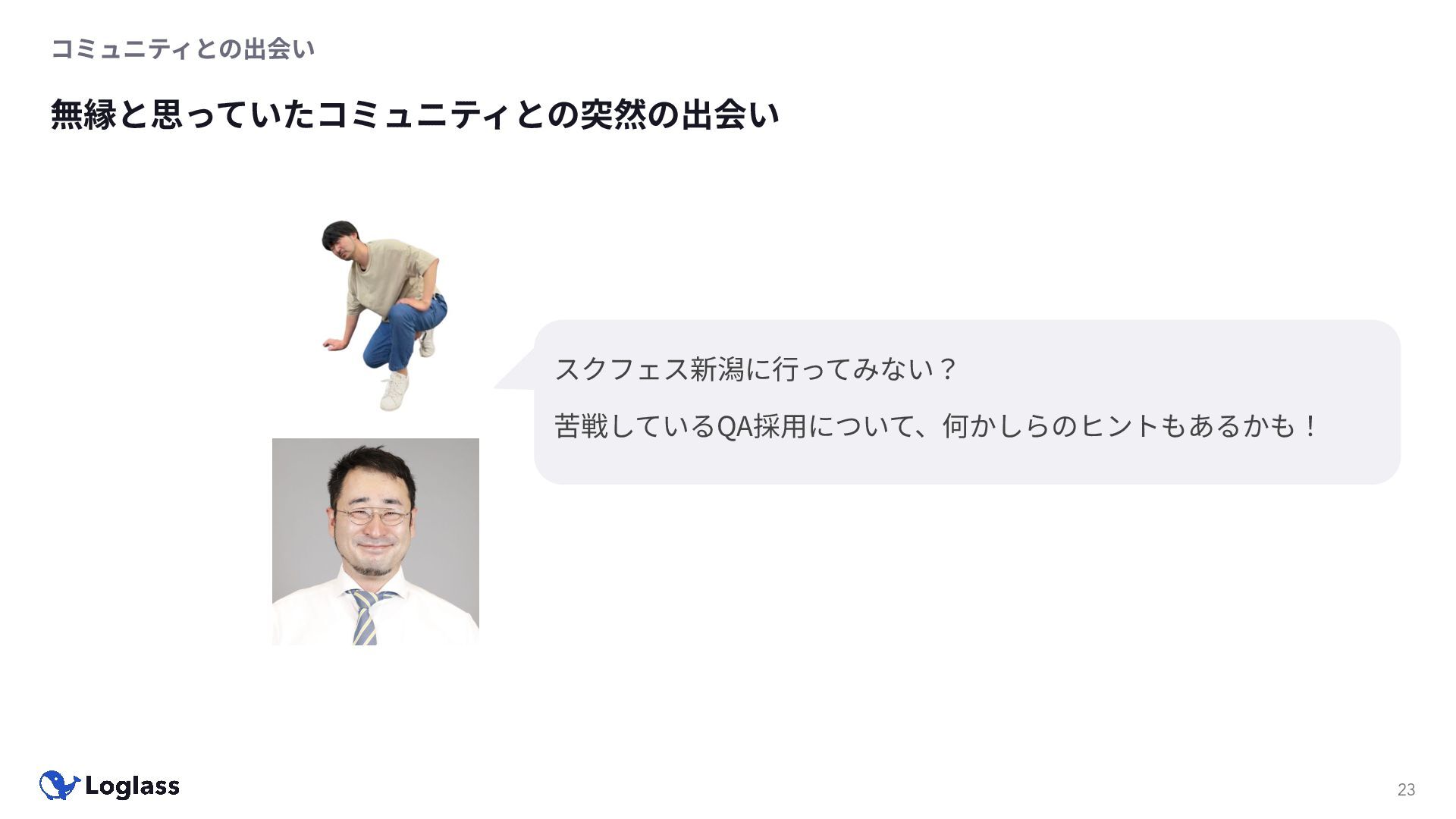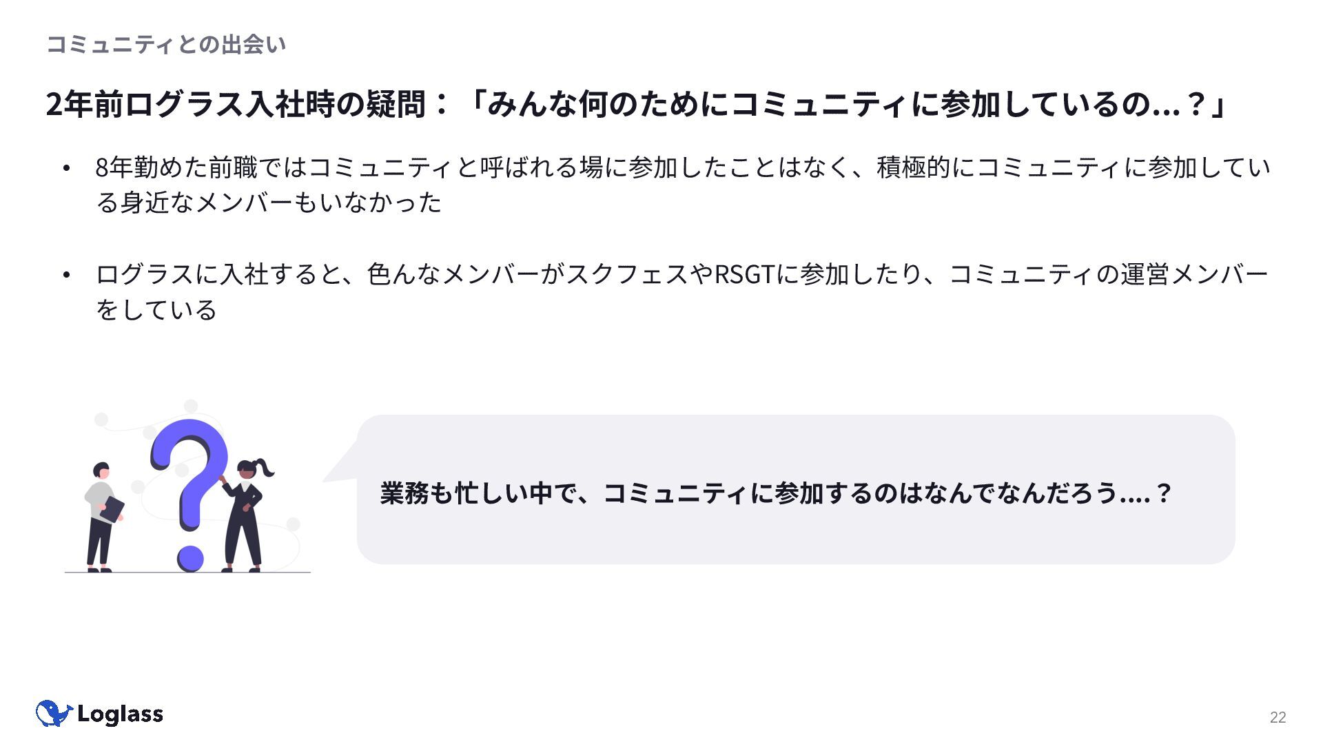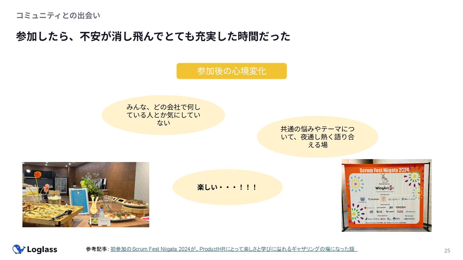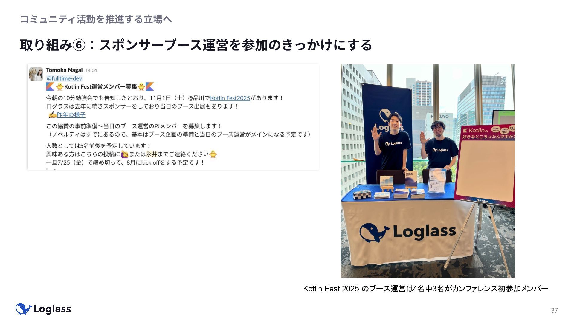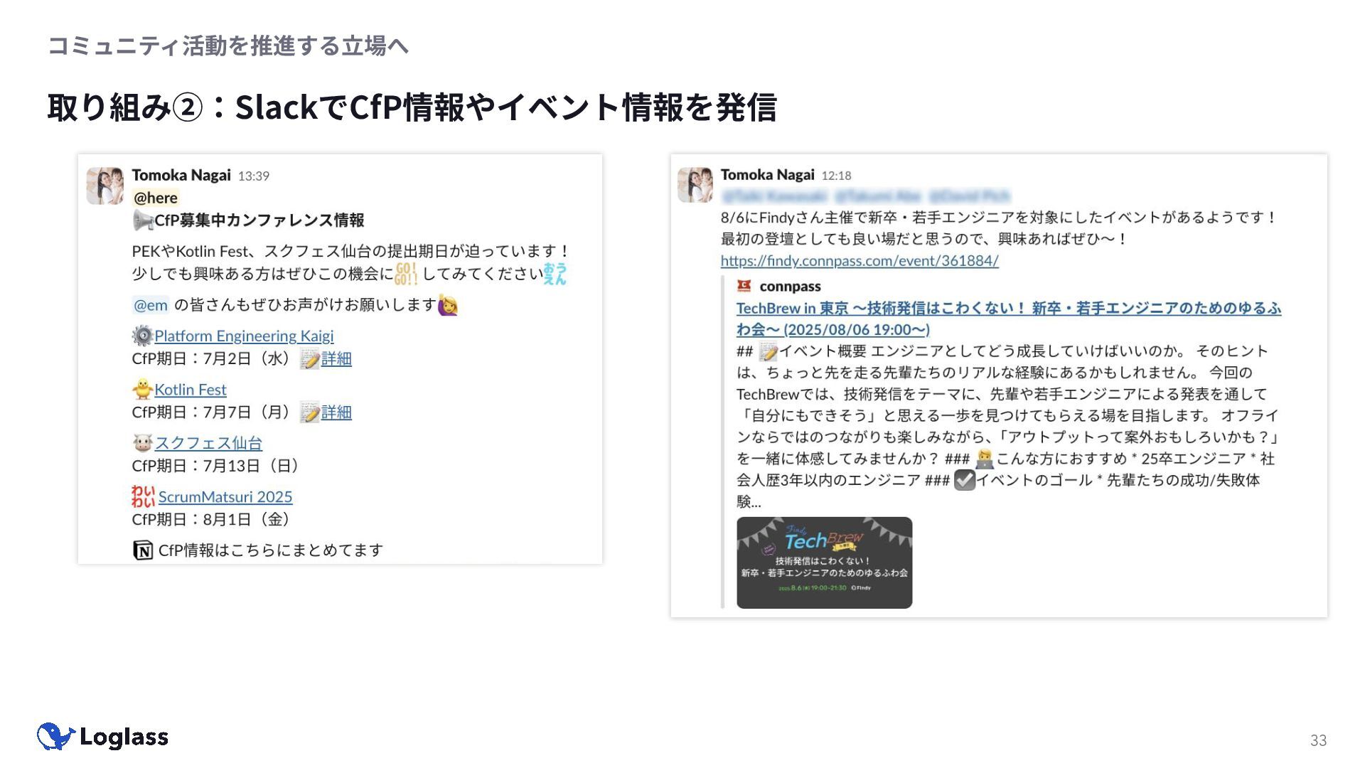 ‐ 短期ではなく⻑期で • 採⽤ブランディングだけでなく、コミュニティに出ていくこと⾃体に⻑期的な学びの価値がある ‐ ⼩さくても⻑く継続させる ‐ スポンサーができる = 会社の中でそのコミュニティへの投資を説明できる⼈がいる ‐ 活動を継続し、ブランディングができれば、新たに参加する参加者のハードルも下げることができる • こうした活動に説得⼒を持たせるのは、⾃⾝がそのコミュニティで⻑く活動していればそのほうがやりや すい ‐ 会社に貢献しようとした時に⼀朝⼀⼣でコミュニティとの繋がりを作ることは難しい ‐ 個⼈のためでもあり、会社のためにも、薄くても⻑く活動を継続することは価値がある 会社の中にコミュニティ⽂化を持ち込む 会社を巻き込む 20