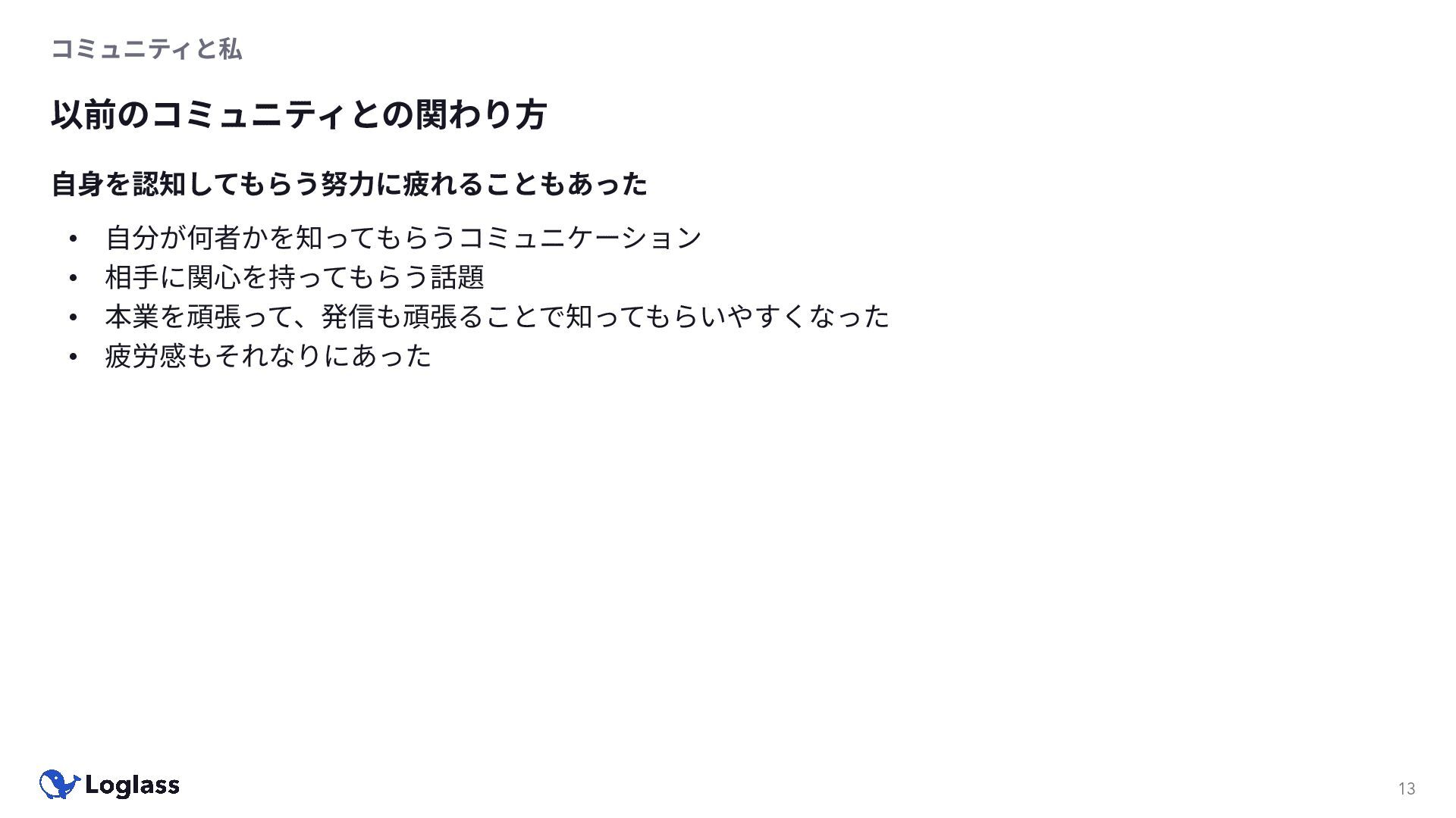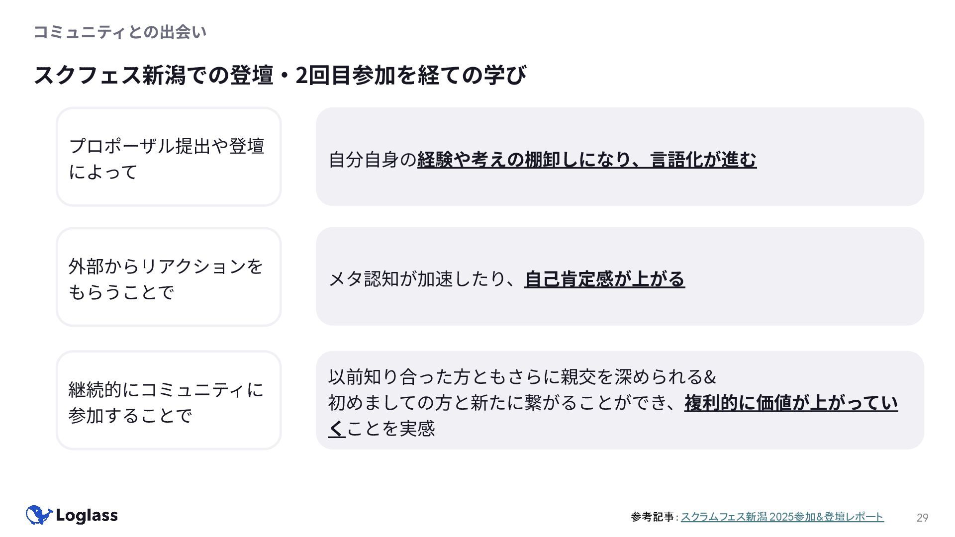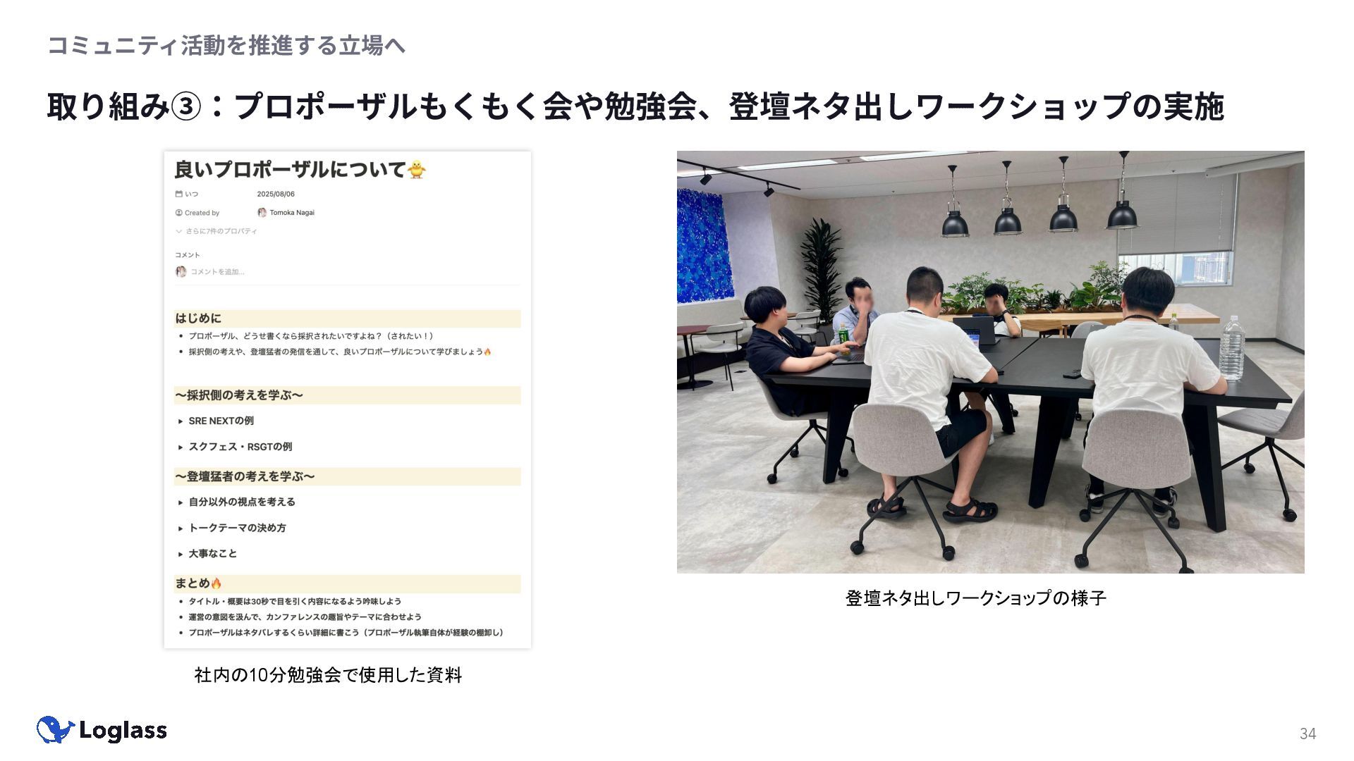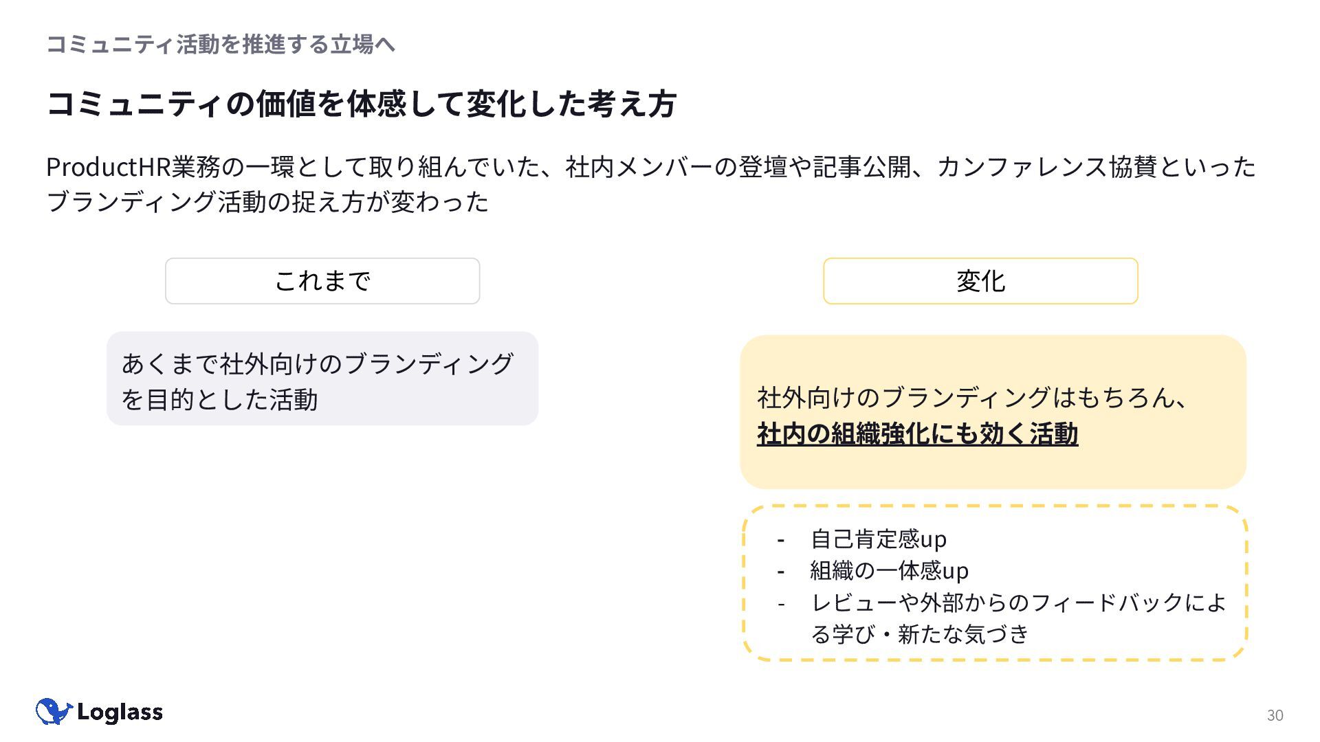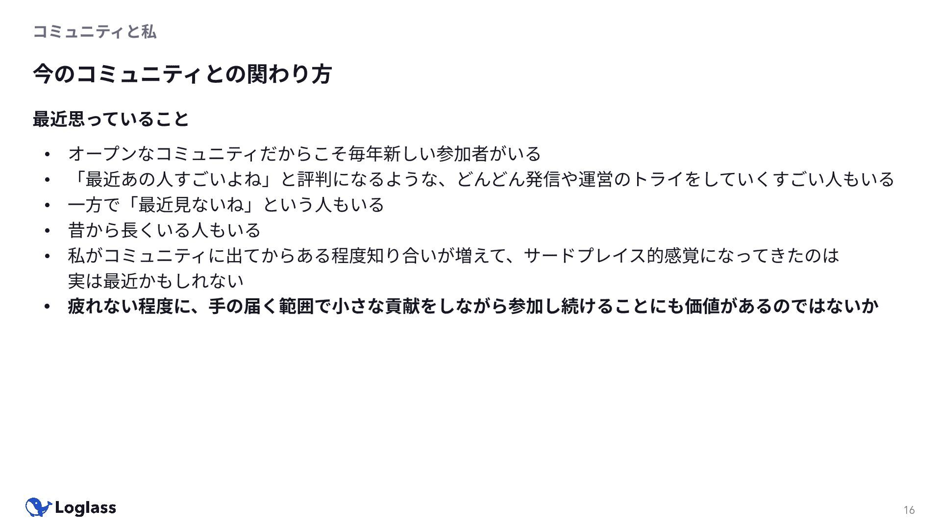 ‐ 短期ではなく⻑期で • 採⽤ブランディングだけでなく、コミュニティに出ていくこと⾃体に⻑期的な学びの価値がある ‐ ⼩さくても⻑く継続させる ‐ スポンサーができる = 会社の中でそのコミュニティへの投資を説明できる⼈がいる ‐ 活動を継続し、ブランディングができれば、新たに参加する参加者のハードルも下げることができる • こうした活動に説得⼒を持たせるのは、⾃⾝がそのコミュニティで⻑く活動していればそのほうがやりや すい ‐ 会社に貢献しようとした時に⼀朝⼀⼣でコミュニティとの繋がりを作ることは難しい ‐ 個⼈のためでもあり、会社のためにも、薄くても⻑く活動を継続することは価値がある 会社の中にコミュニティ⽂化を持ち込む 会社を巻き込む 20