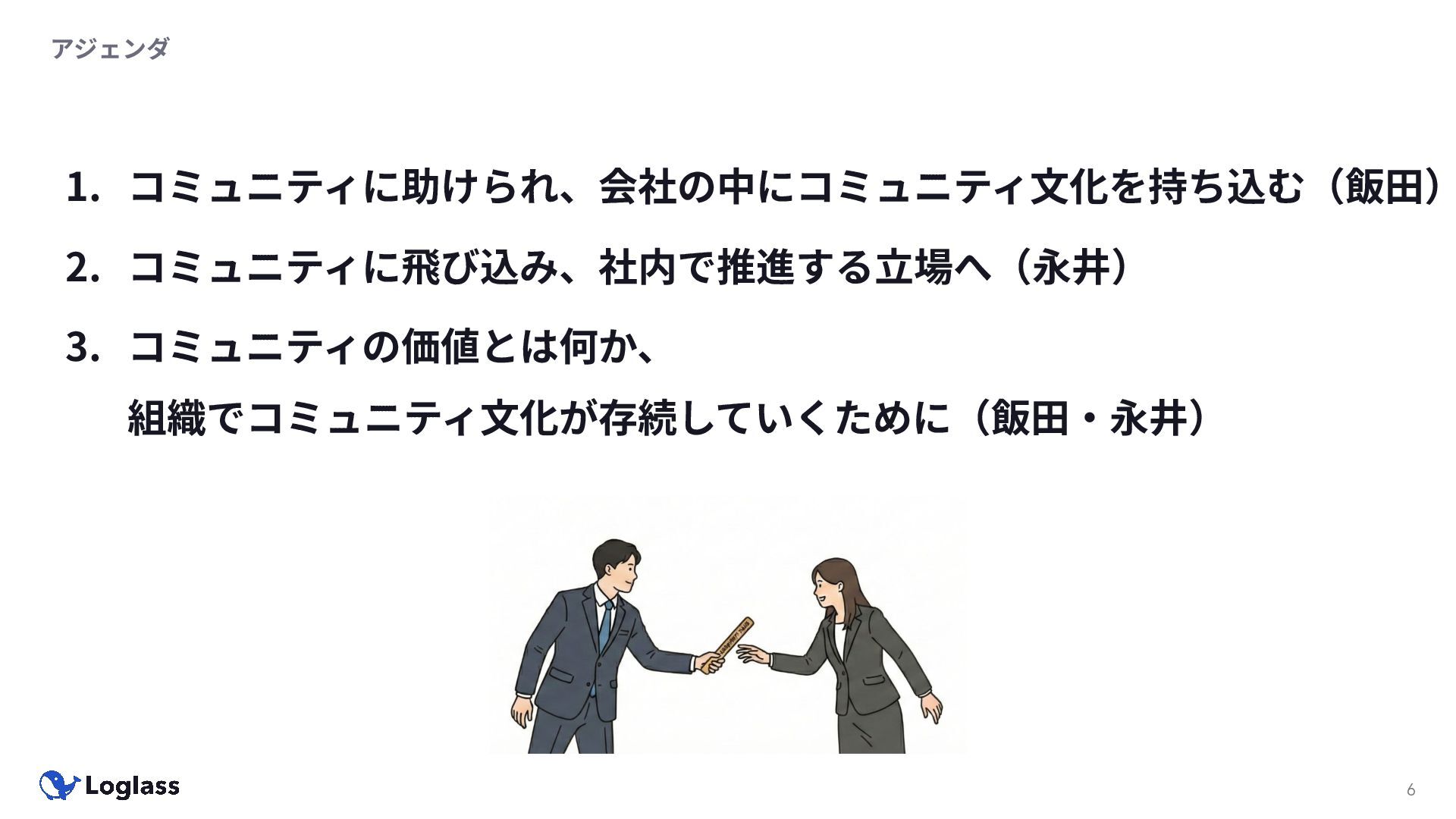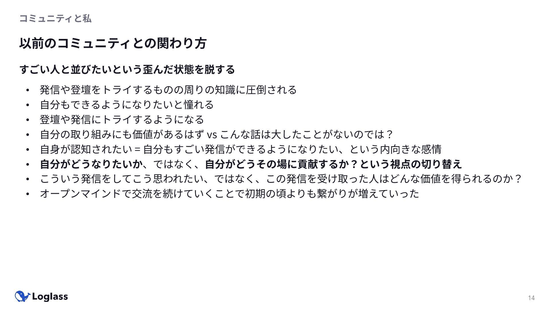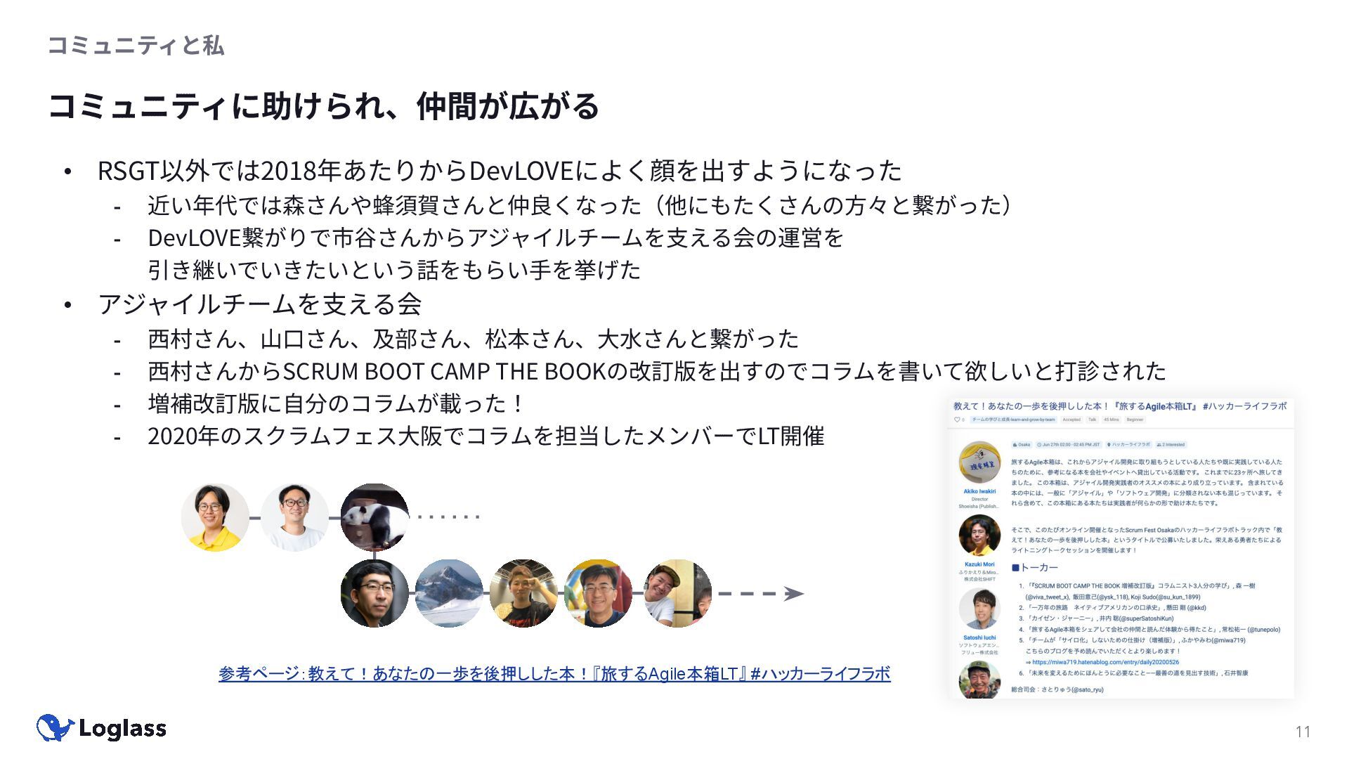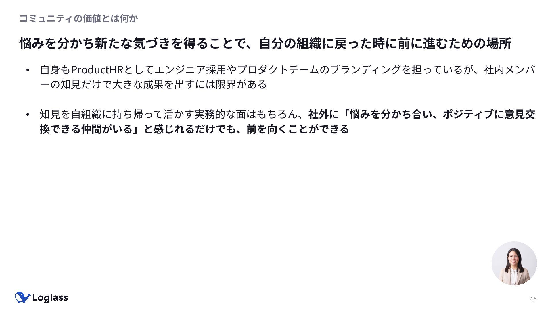 ‐ 短期ではなく⻑期で • 採⽤ブランディングだけでなく、コミュニティに出ていくこと⾃体に⻑期的な学びの価値がある ‐ ⼩さくても⻑く継続させる ‐ スポンサーができる = 会社の中でそのコミュニティへの投資を説明できる⼈がいる ‐ 活動を継続し、ブランディングができれば、新たに参加する参加者のハードルも下げることができる • こうした活動に説得⼒を持たせるのは、⾃⾝がそのコミュニティで⻑く活動していればそのほうがやりや すい ‐ 会社に貢献しようとした時に⼀朝⼀⼣でコミュニティとの繋がりを作ることは難しい ‐ 個⼈のためでもあり、会社のためにも、薄くても⻑く活動を継続することは価値がある 会社の中にコミュニティ⽂化を持ち込む 会社を巻き込む 20