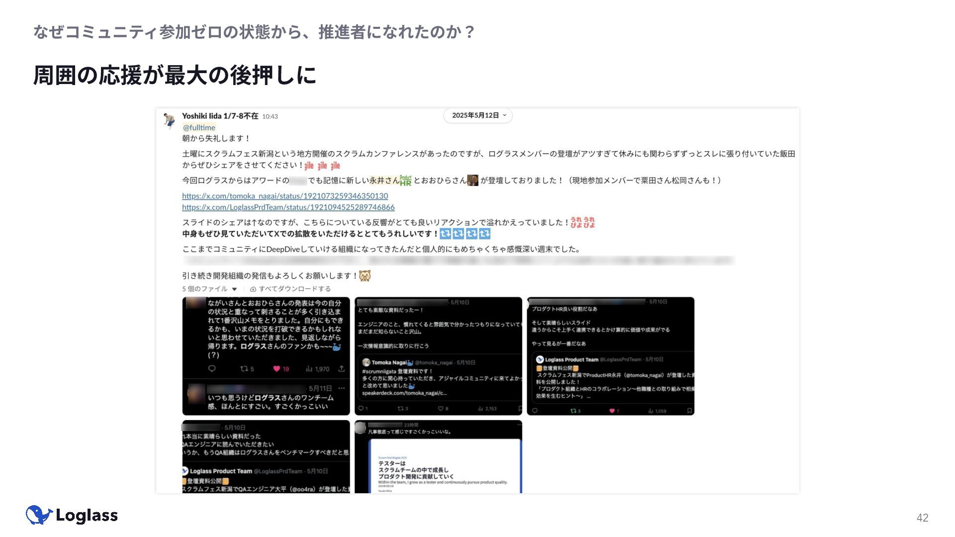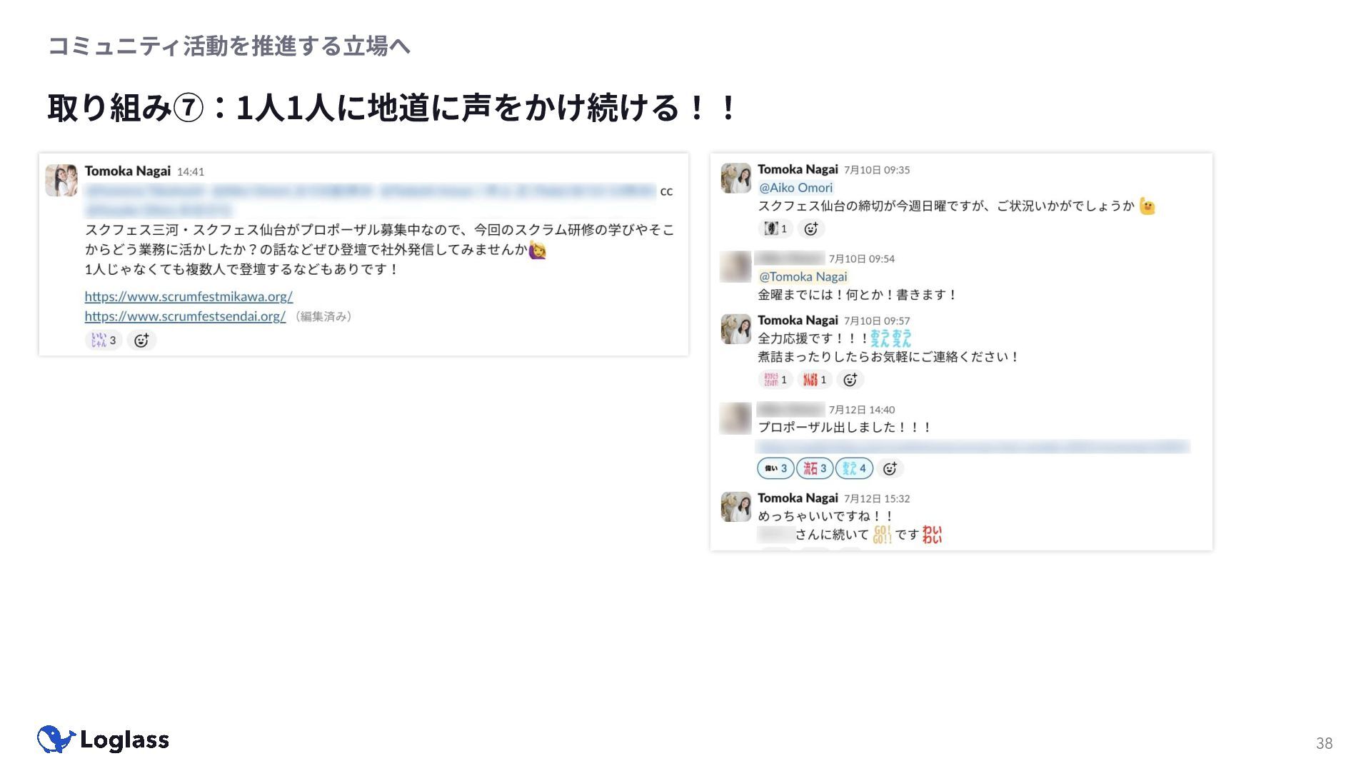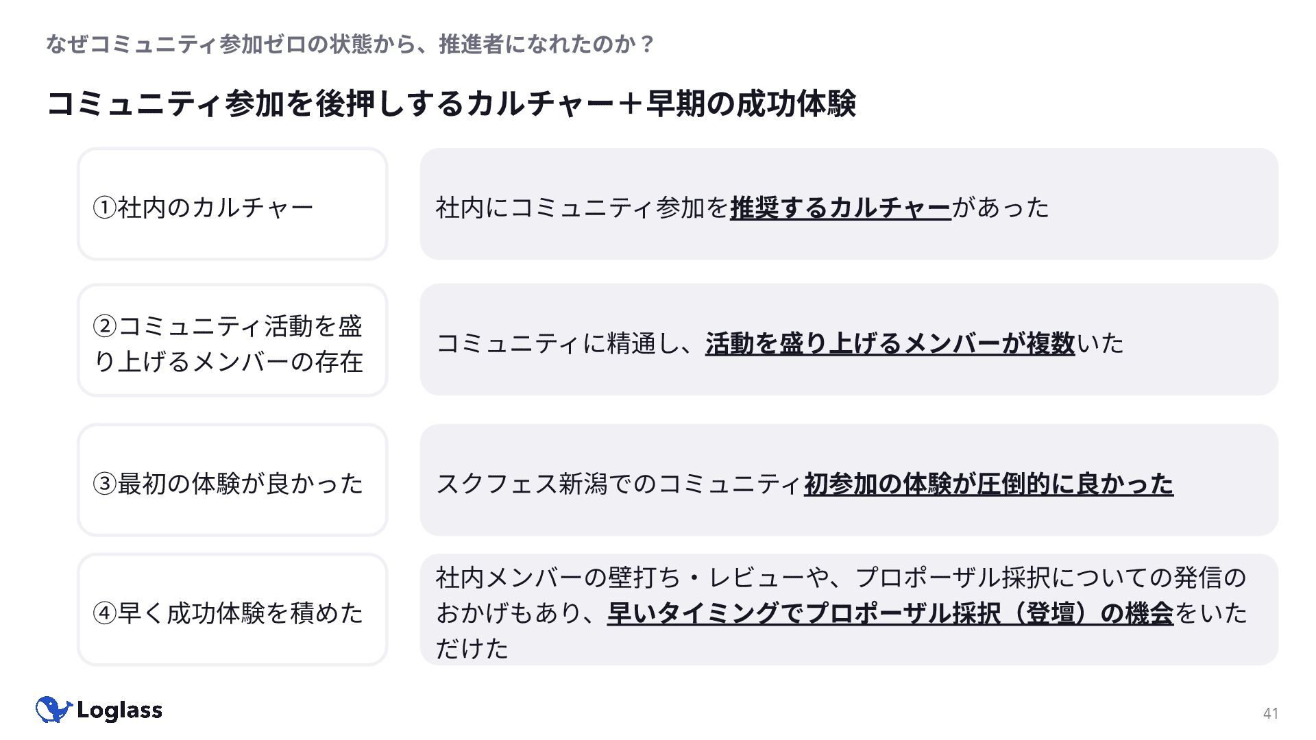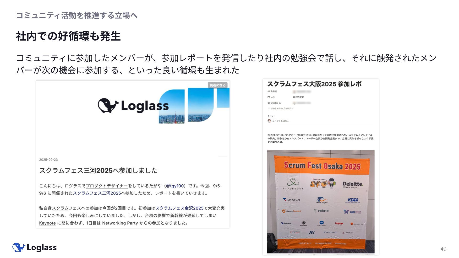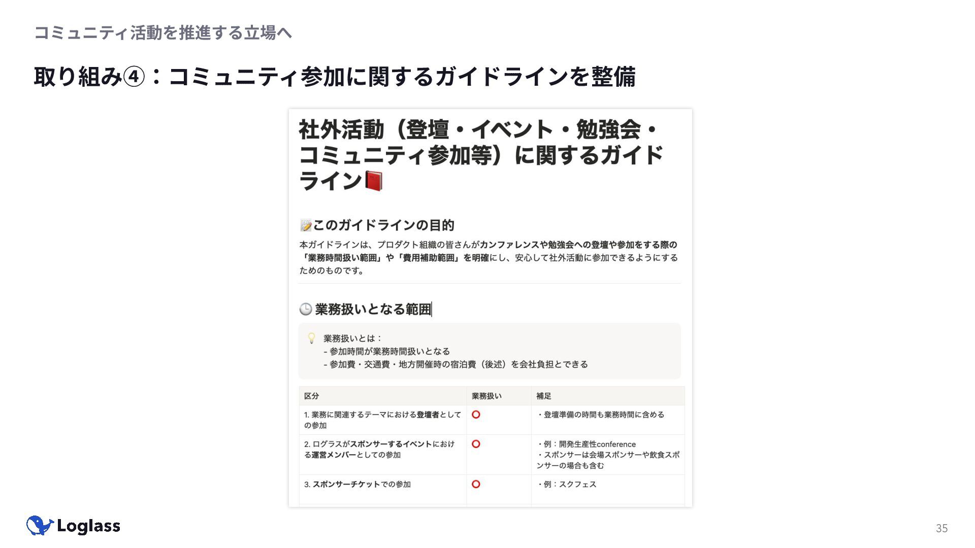‐ 短期ではなく⻑期で • 採⽤ブランディングだけでなく、コミュニティに出ていくこと⾃体に⻑期的な学びの価値がある ‐ ⼩さくても⻑く継続させる ‐ スポンサーができる = 会社の中でそのコミュニティへの投資を説明できる⼈がいる ‐ 活動を継続し、ブランディングができれば、新たに参加する参加者のハードルも下げることができる • こうした活動に説得⼒を持たせるのは、⾃⾝がそのコミュニティで⻑く活動していればそのほうがやりや すい ‐ 会社に貢献しようとした時に⼀朝⼀⼣でコミュニティとの繋がりを作ることは難しい ‐ 個⼈のためでもあり、会社のためにも、薄くても⻑く活動を継続することは価値がある 会社の中にコミュニティ⽂化を持ち込む 会社を巻き込む 20